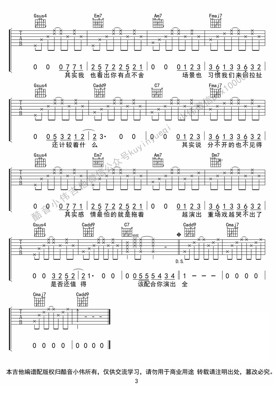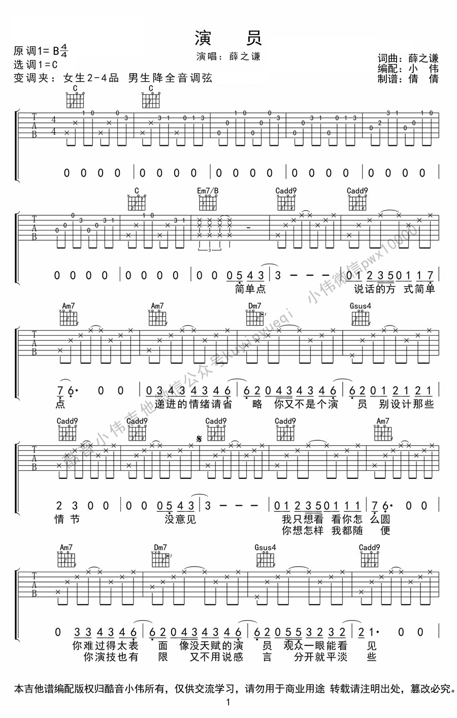 曲谱介绍: 薛之谦《演员》吉他弹唱谱,采用C调指法编配,共有3张高清图谱。