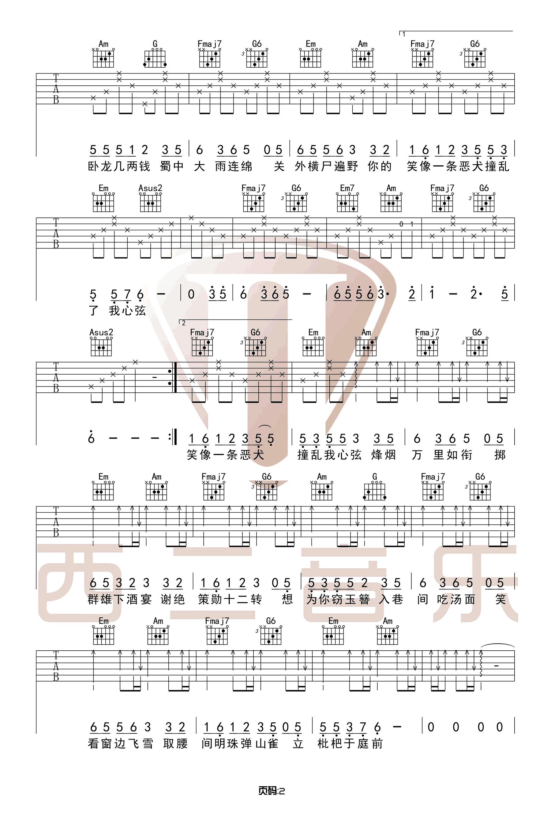 曲谱介绍: 花粥《盗将行》吉他弹唱谱,采用C调指法编配原版,共有3张高清图谱。