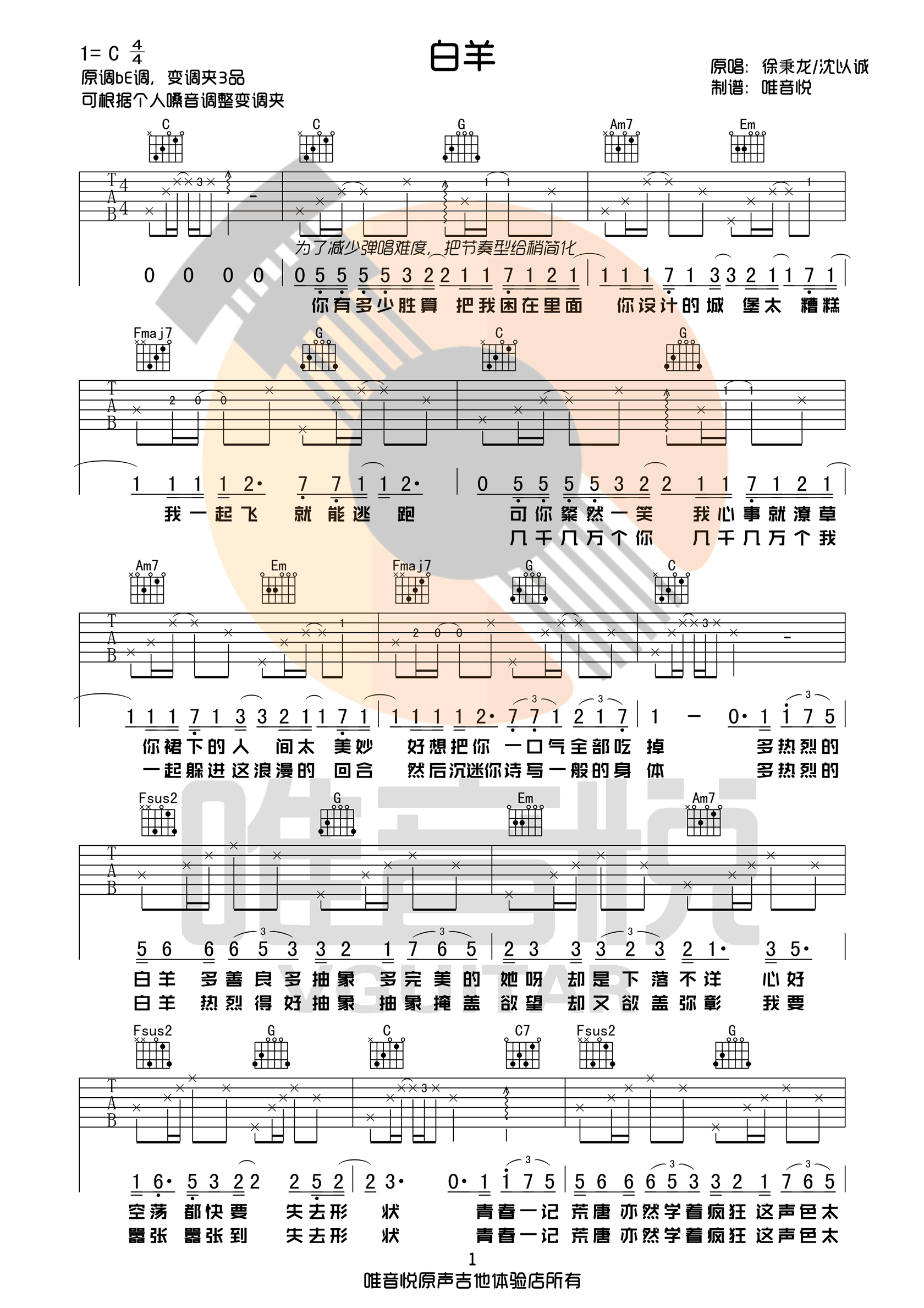 曲谱介绍: 徐秉龙《白羊》吉他弹唱谱,采用C调指法编配,唯音悦编配出品,共有2张高清图谱,免翻页排版设计。