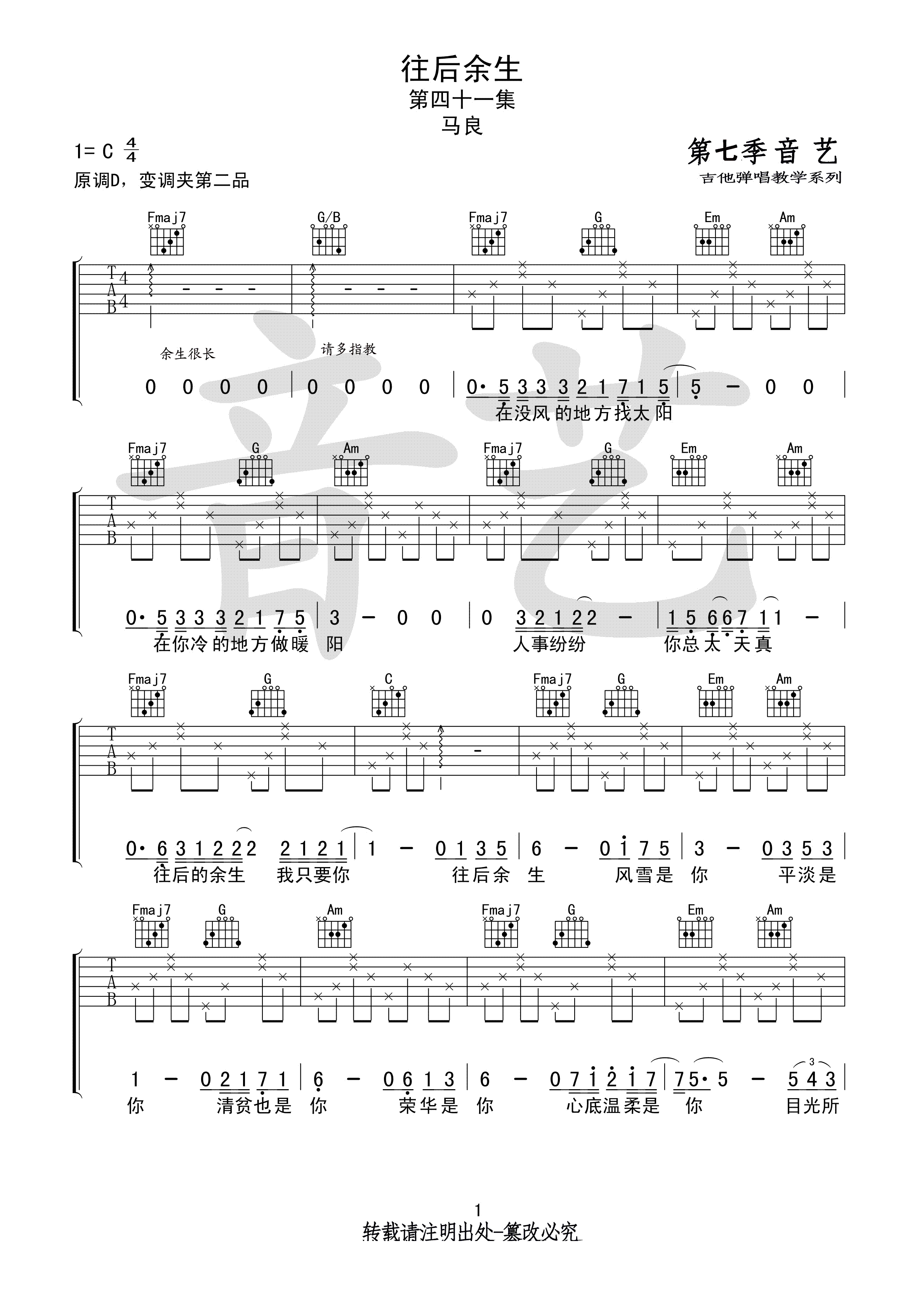 曲谱介绍: 马良《往后余生》吉他弹唱谱,采用C调指法编配,共有2张高清图谱,免翻页排版设计。