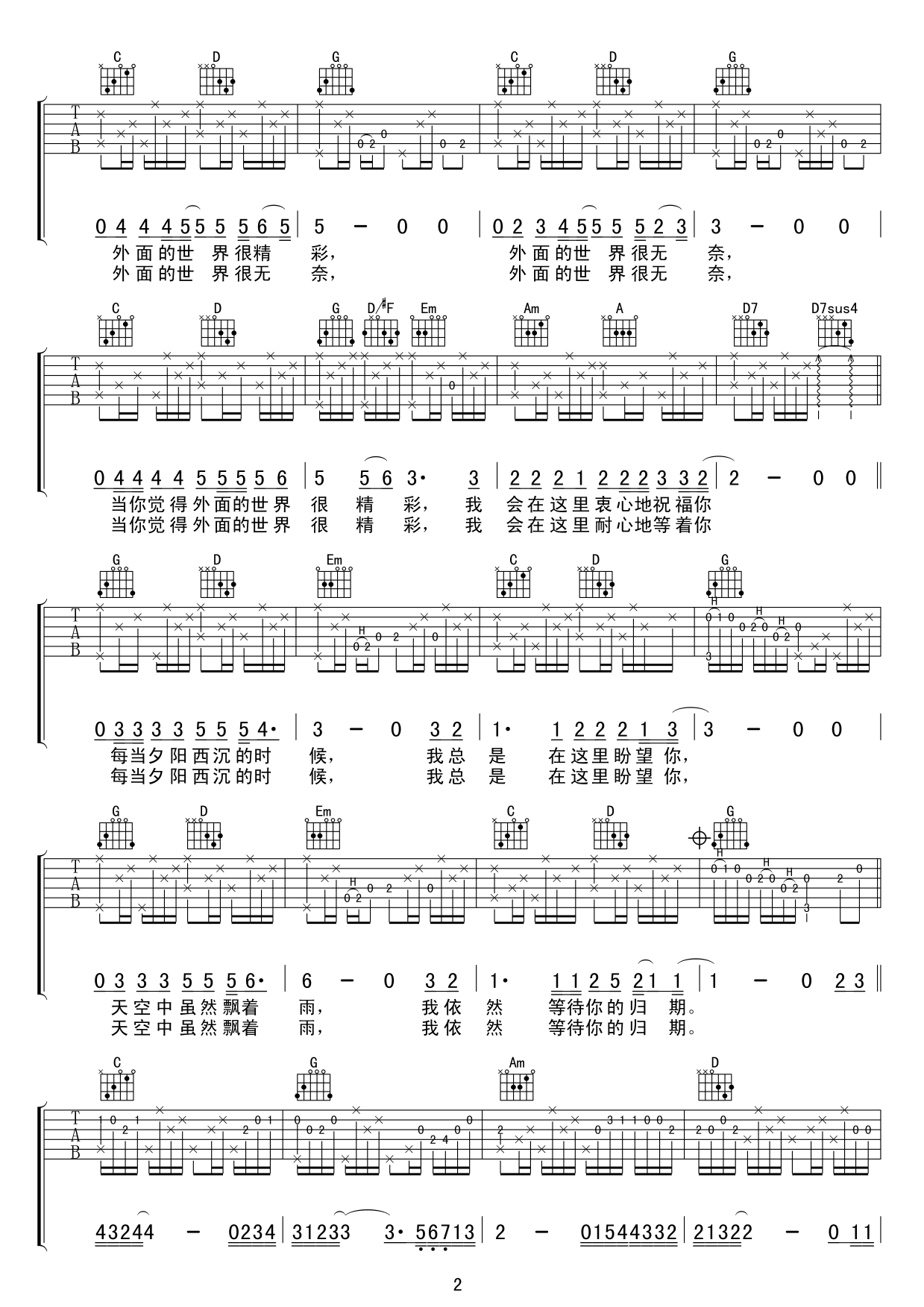 曲谱介绍: 齐秦《外面的世界》吉他弹唱谱,采用G调指法编配,共有3张高清图谱。