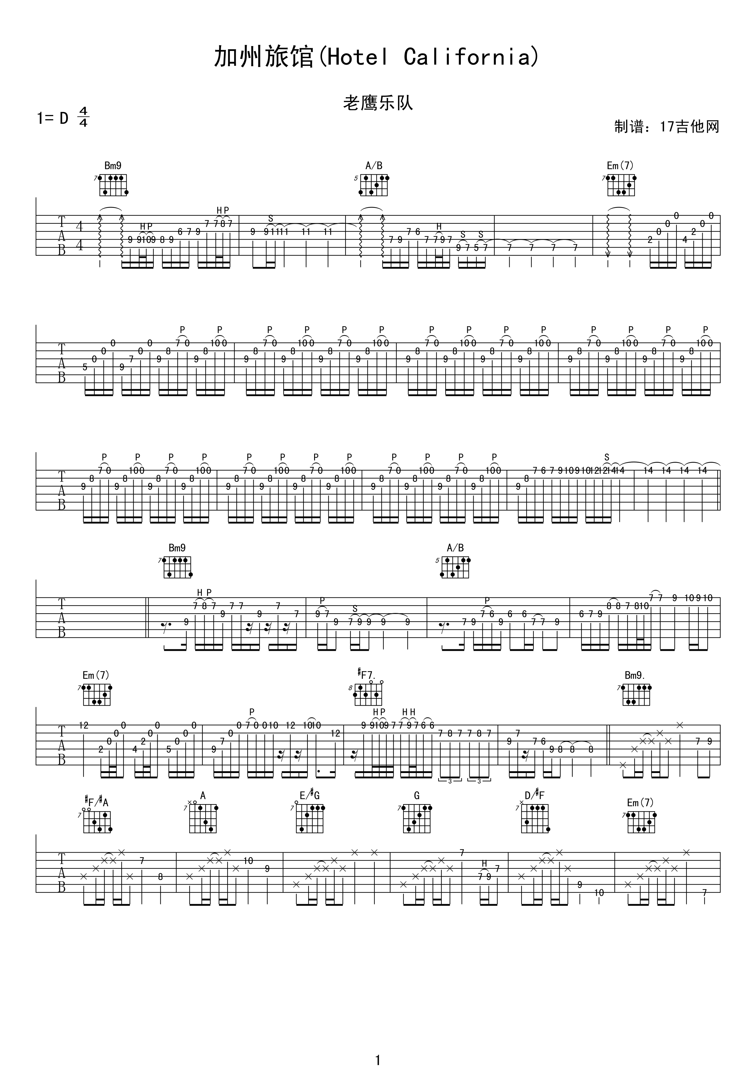 曲谱介绍: 老鹰乐队Hotel《加州旅馆》吉他弹唱谱,采用D调指法编配原版,共有8张高清图谱。