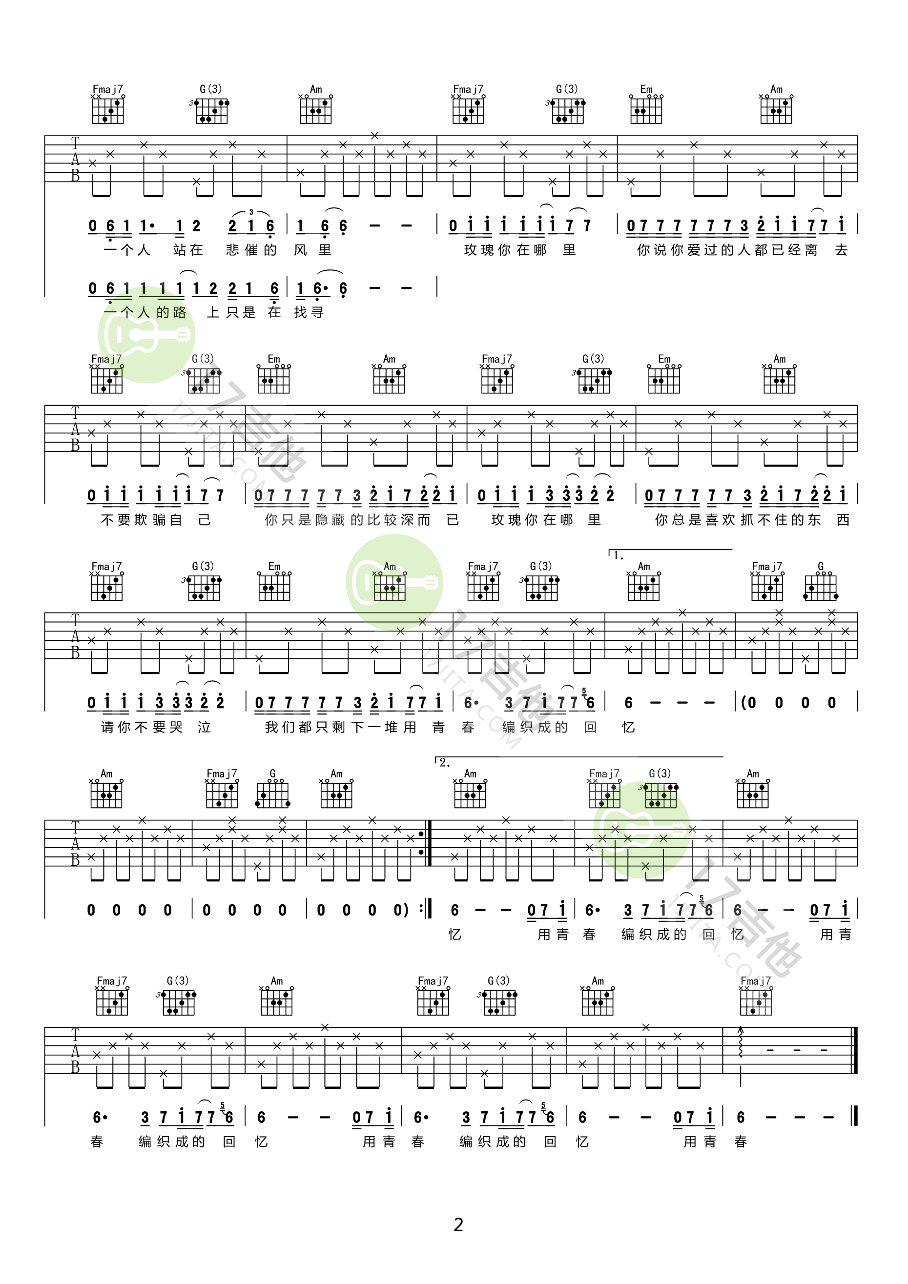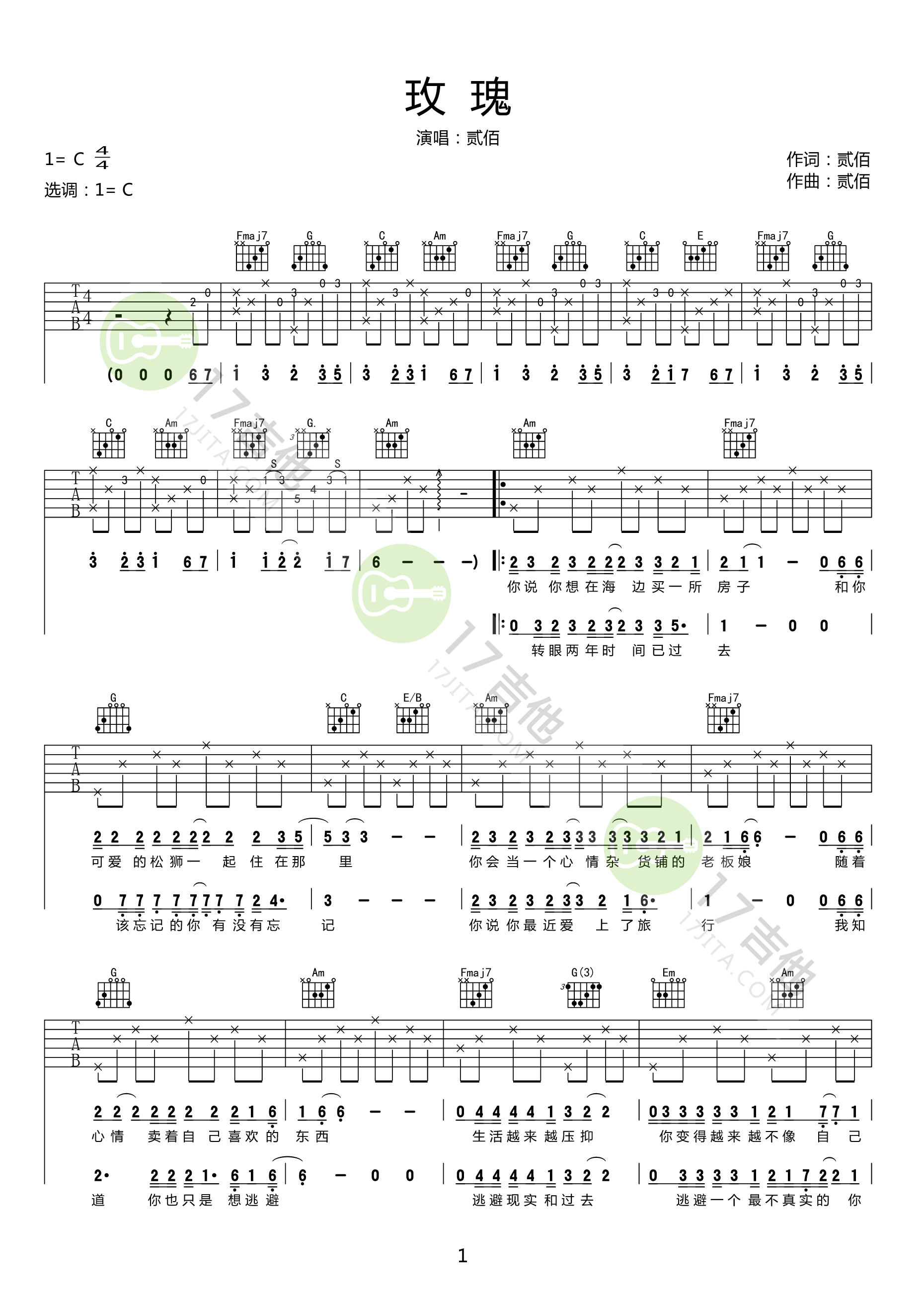 曲谱介绍: 贰佰《玫瑰》吉他弹唱谱,采用C调指法编配,共有2张高清图谱,免翻页排版设计。