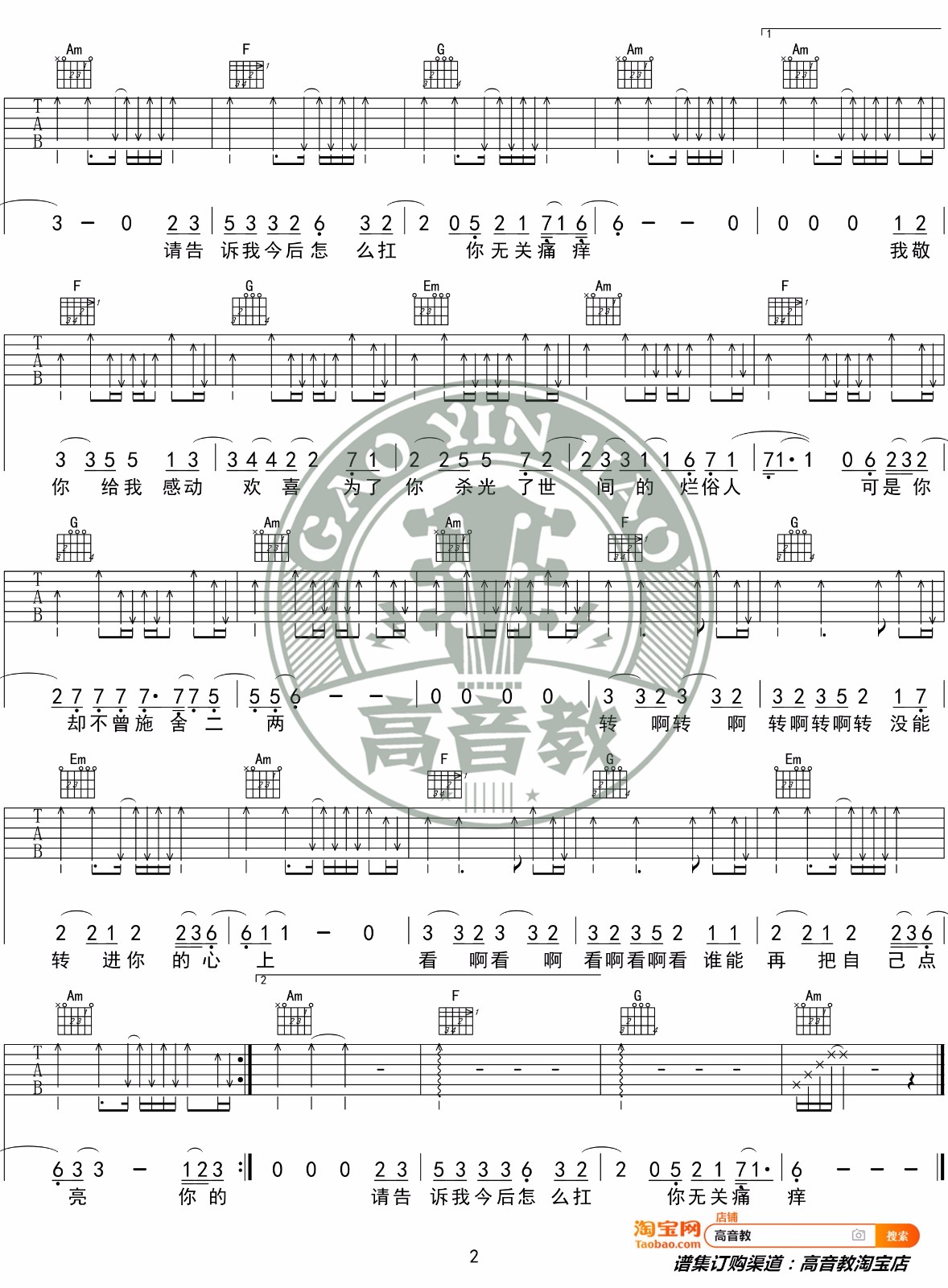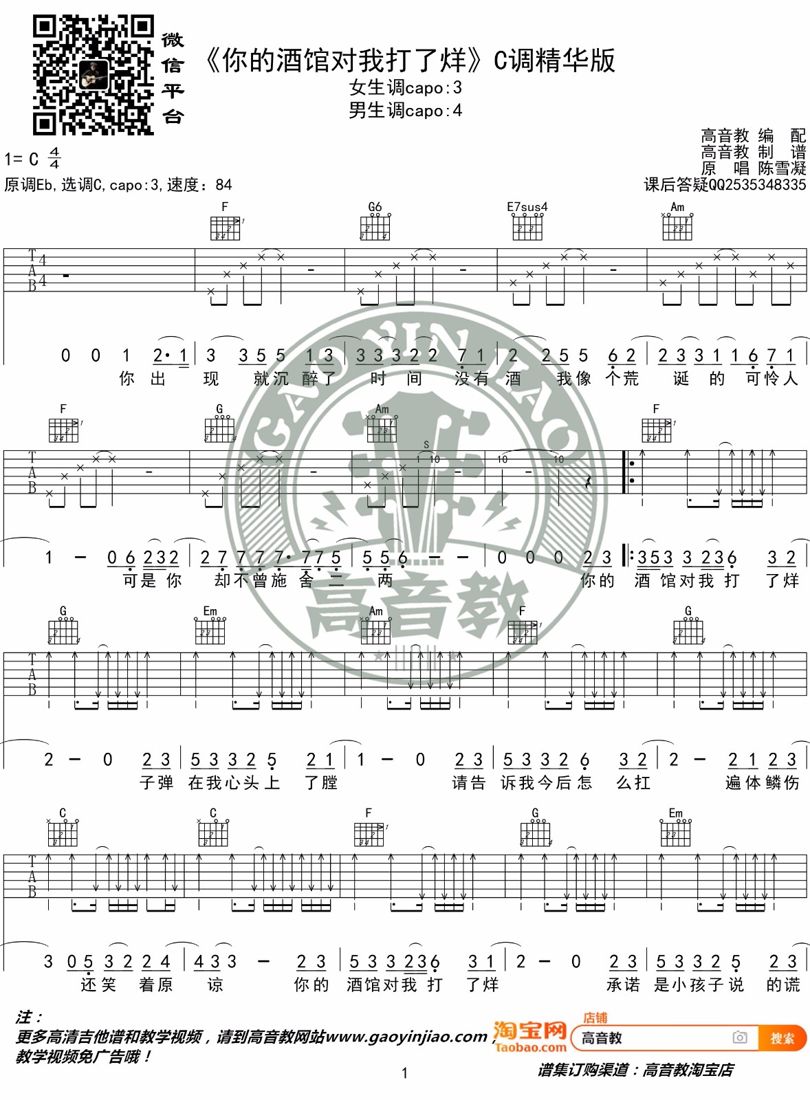 曲谱介绍: 《你的酒馆对我打了烊》吉他弹唱谱,采用C调指法编配原版,共有2张高清图谱,免翻页排版设计。