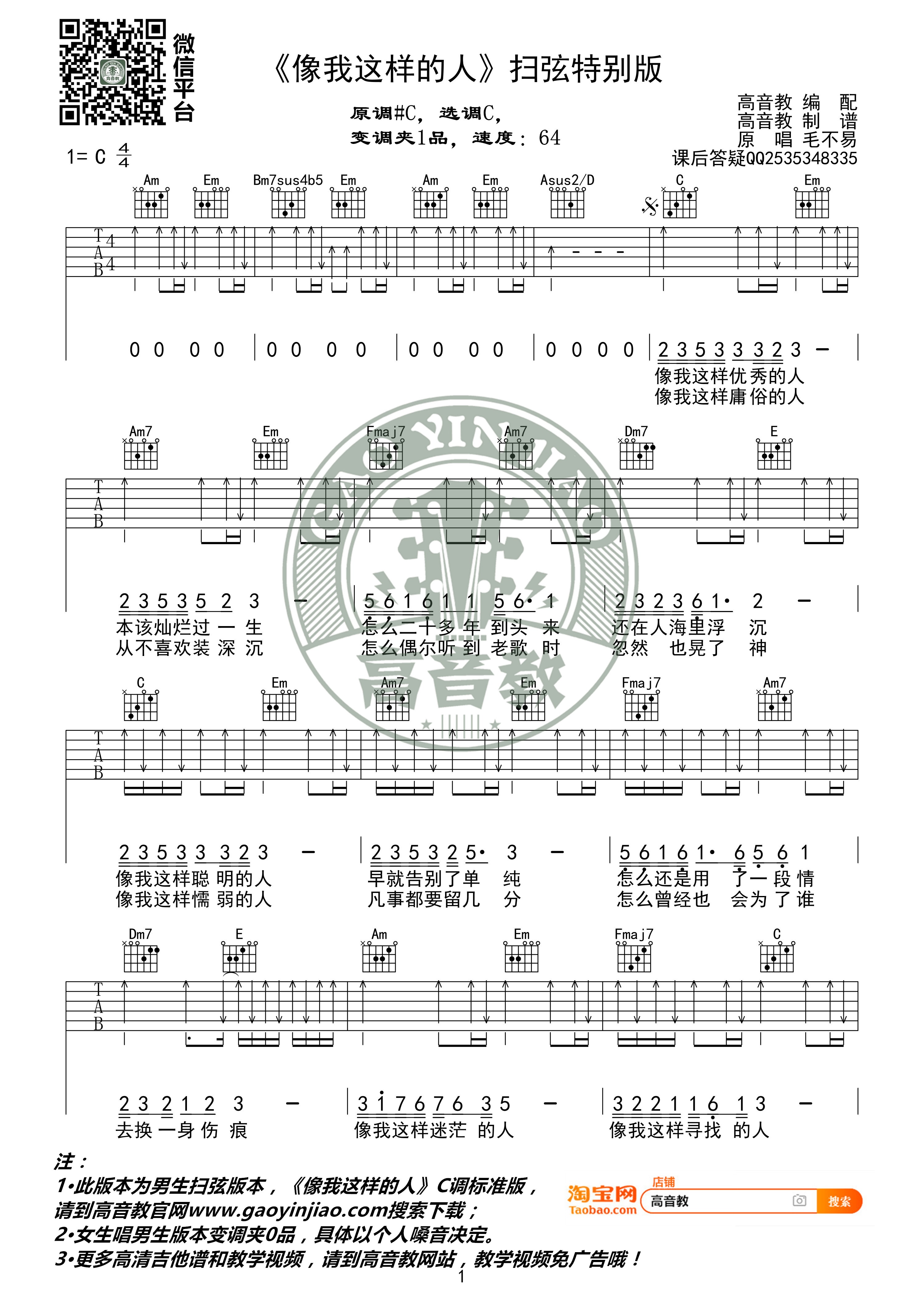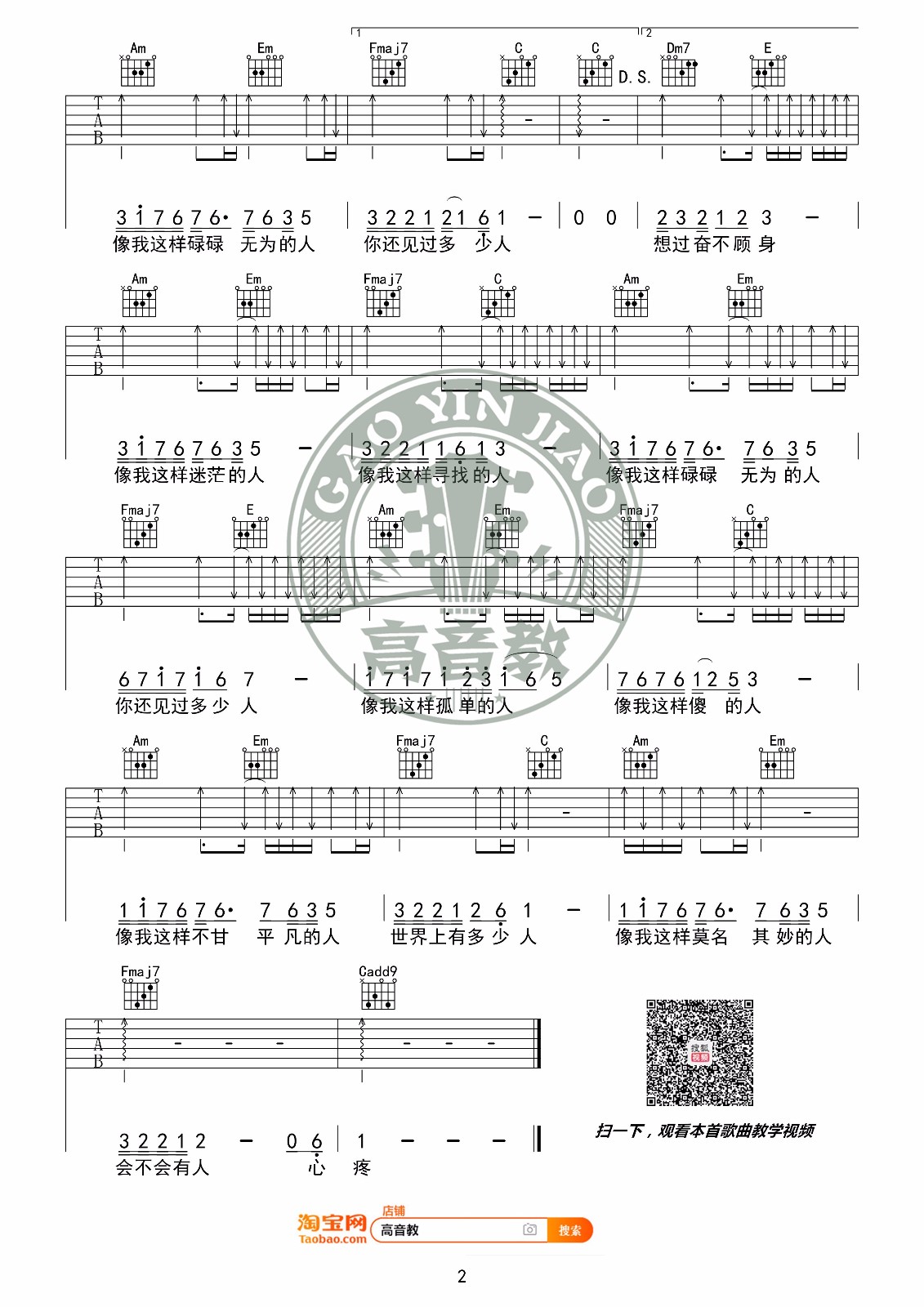 曲谱介绍: 毛不易《像我这样的人》吉他弹唱谱,采用C调指法编配,共有2张高清图谱,免翻页排版设计。