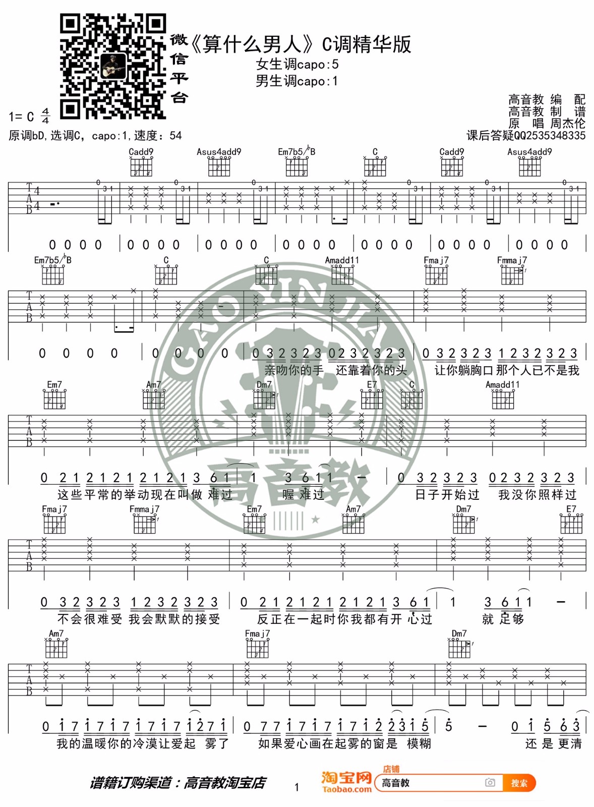曲谱介绍: 周杰伦《算什么男人》吉他弹唱谱,采用C调指法编配原版,共有2张高清图谱,免翻页排版设计。