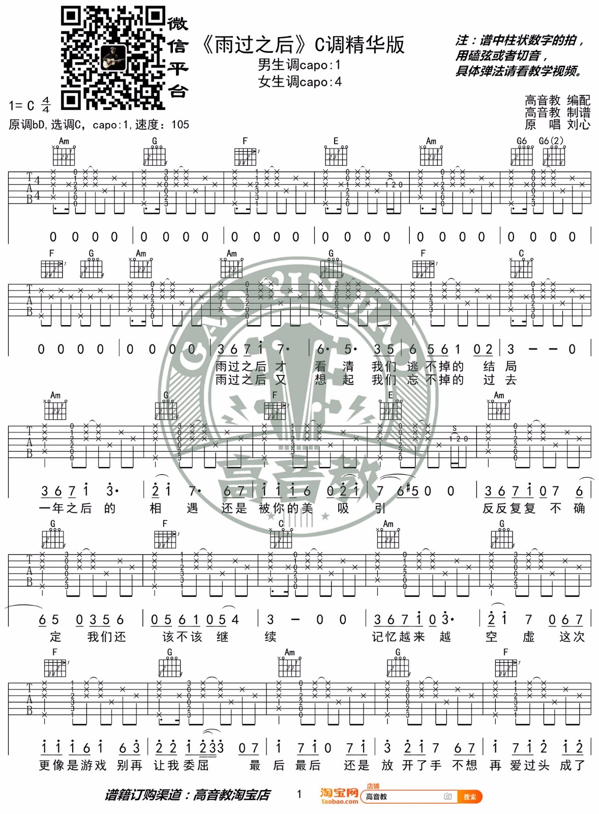 曲谱介绍: 刘心《雨过之后》吉他弹唱谱,采用C调指法编配原版,共有2张高清图谱,免翻页排版设计。