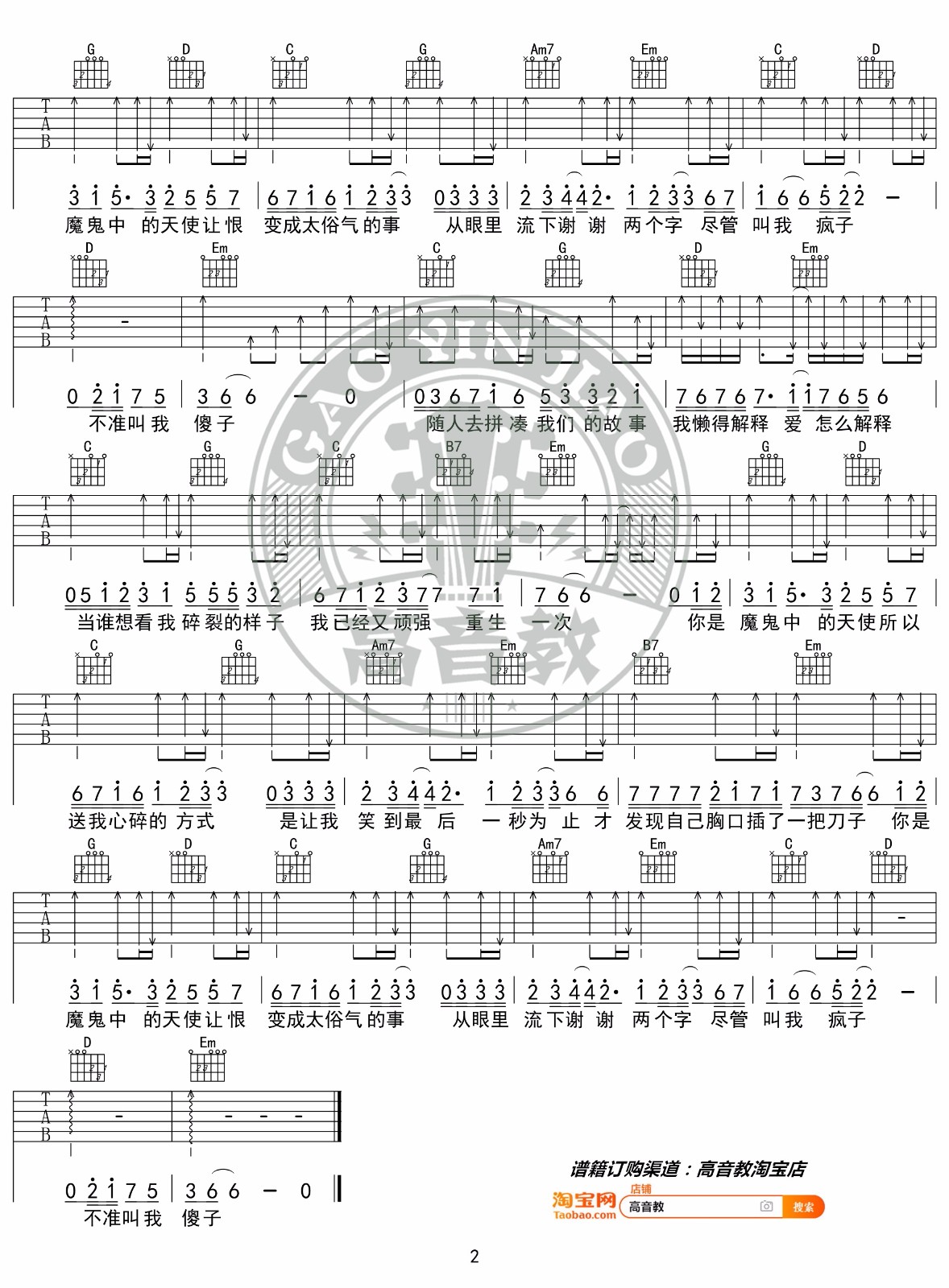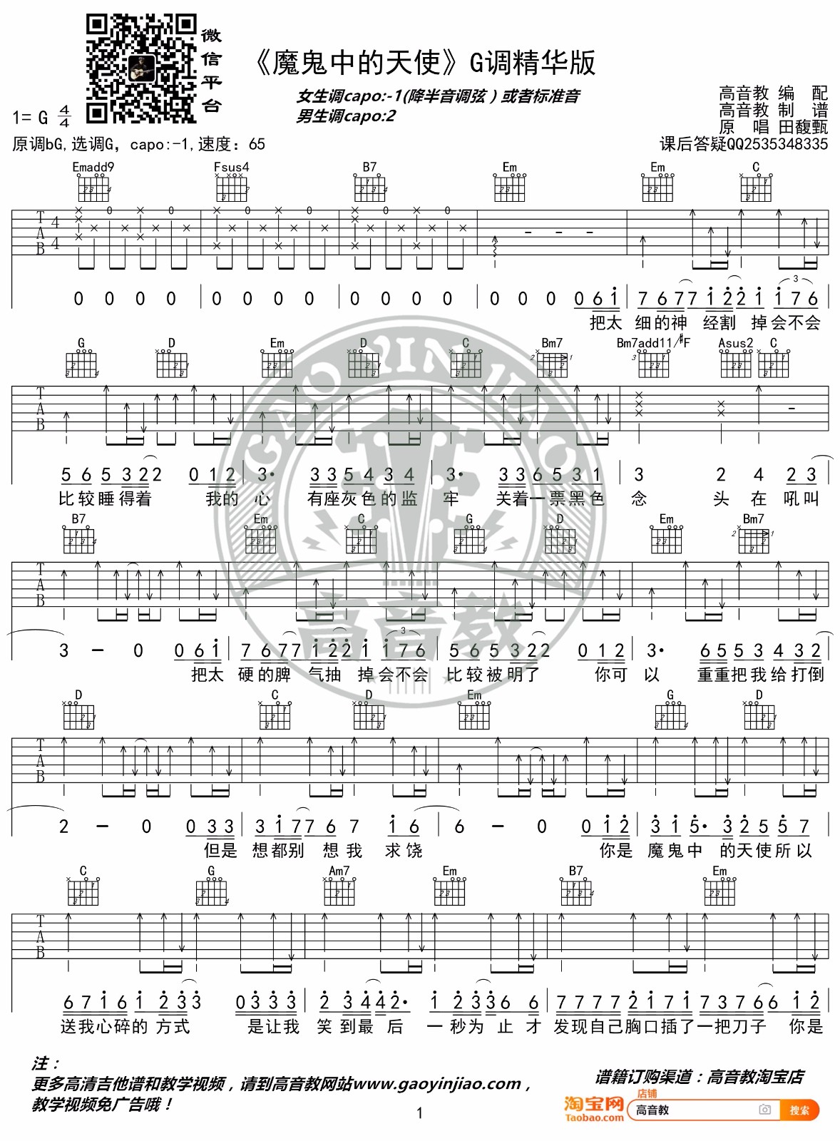 曲谱介绍: 田馥甄《魔鬼中的天使》吉他弹唱谱,采用G调指法编配原版,共有2张高清图谱,免翻页排版设计。