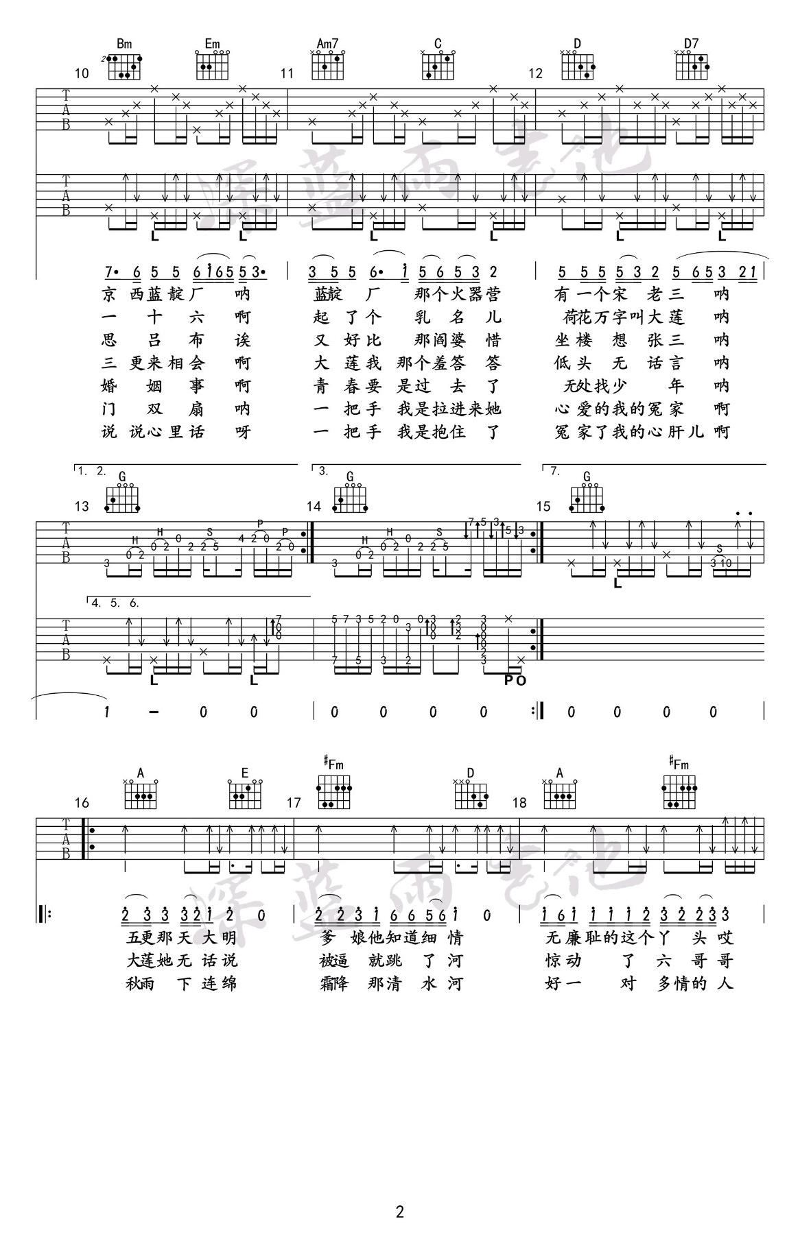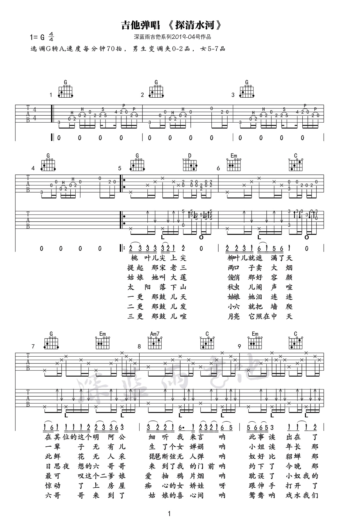 曲谱介绍: 晓月老板《探清水河》吉他弹唱谱,采用A调指法编配原版,共有3张高清图谱。