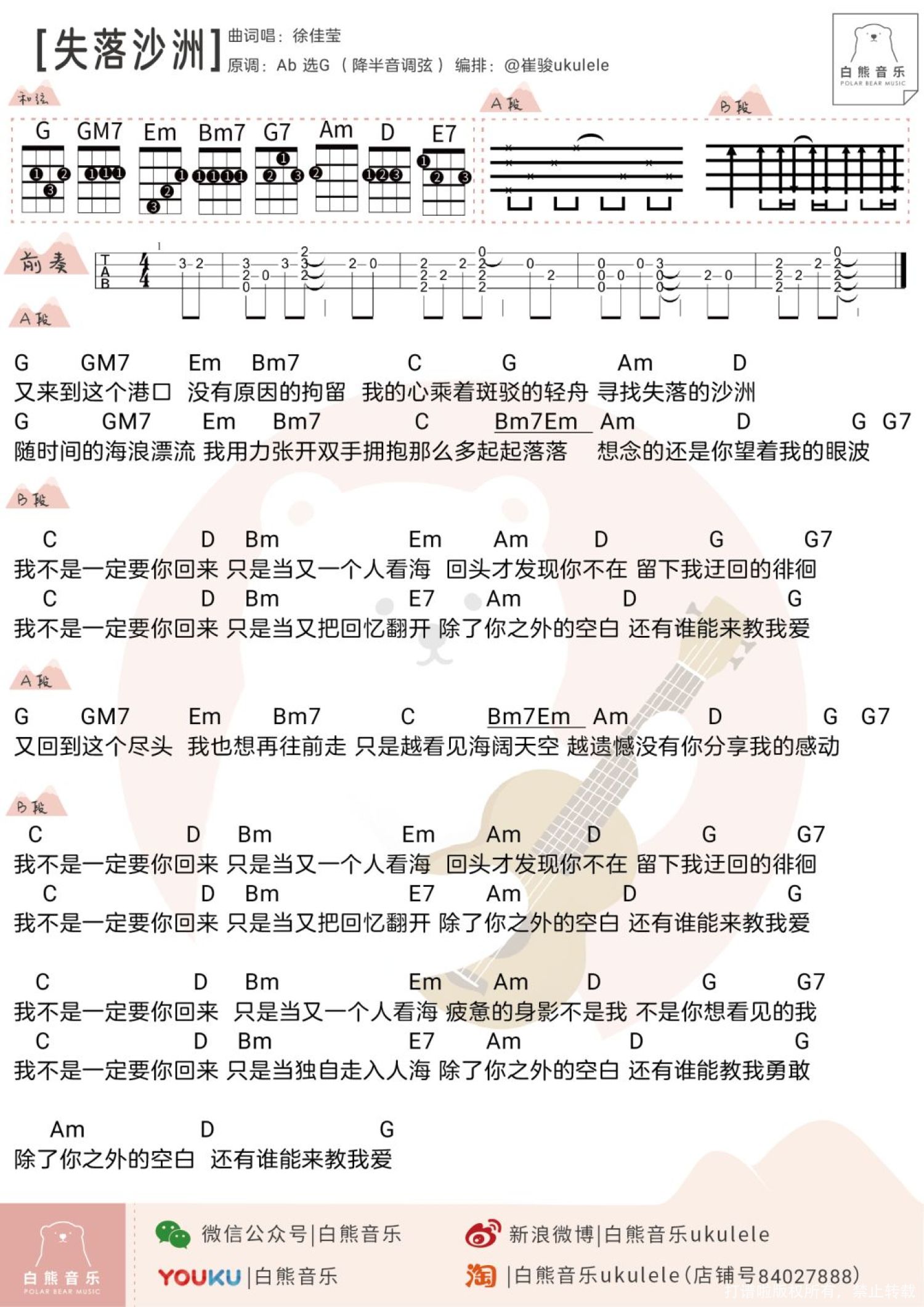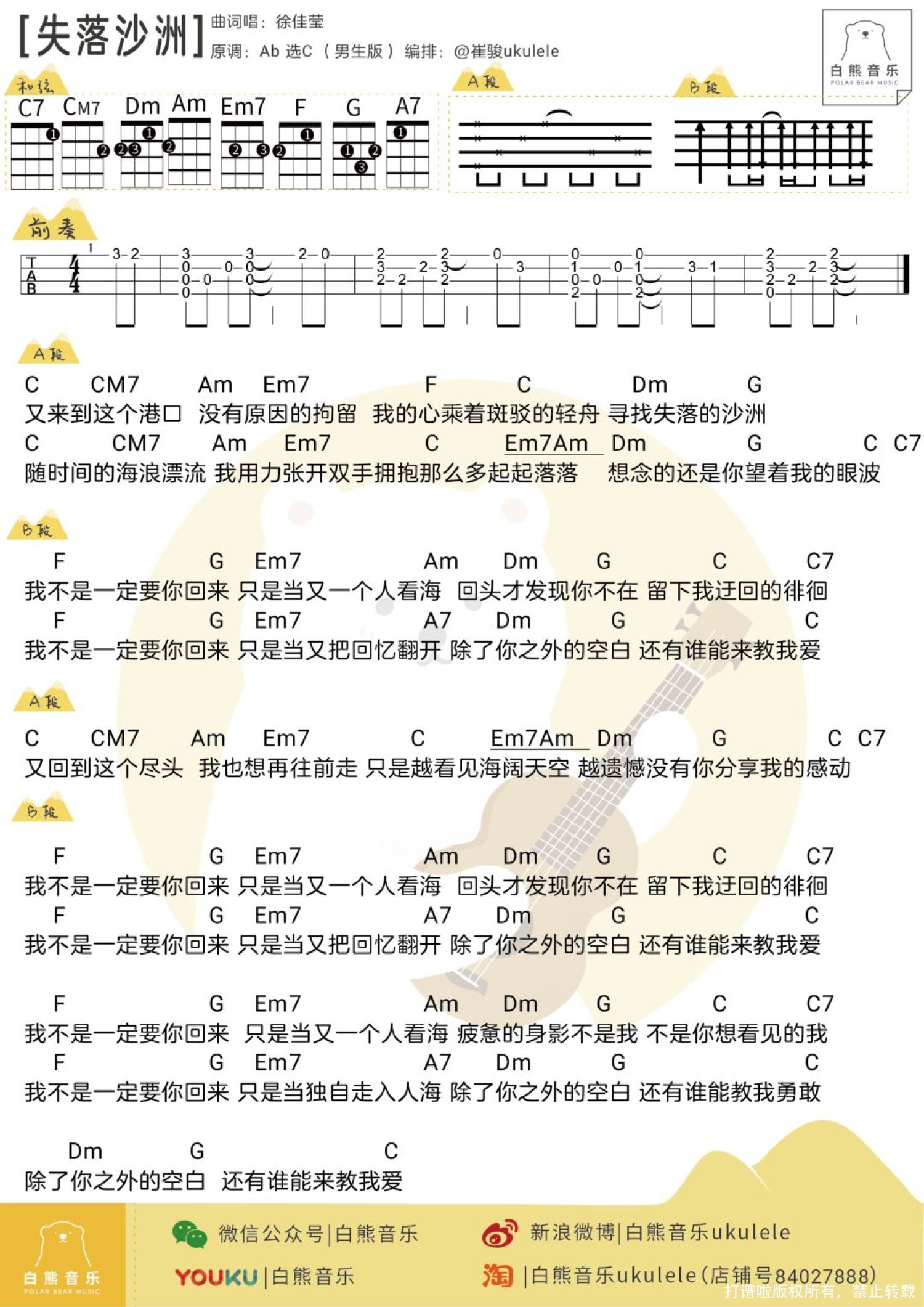 曲谱介绍: 《失落沙洲》尤克里里谱 1、女声版 2、男声版