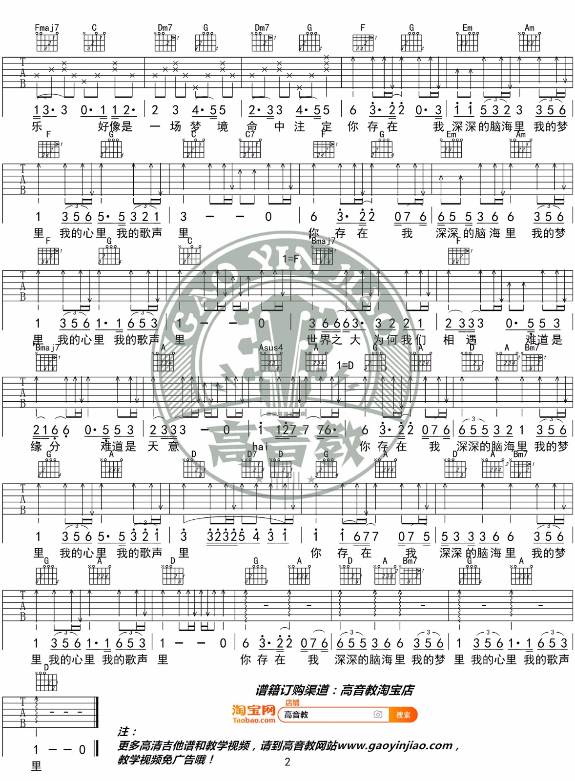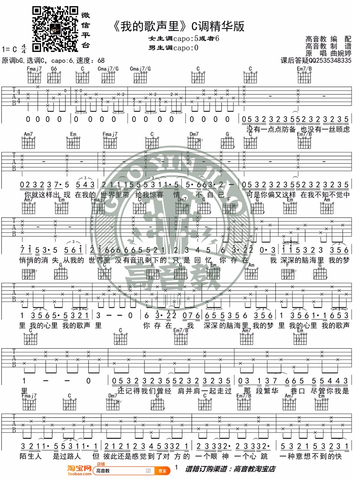 曲谱介绍: 曲婉婷《我的歌声里》吉他弹唱谱,采用C调指法编配原版,共有2张高清图谱,免翻页排版设计。