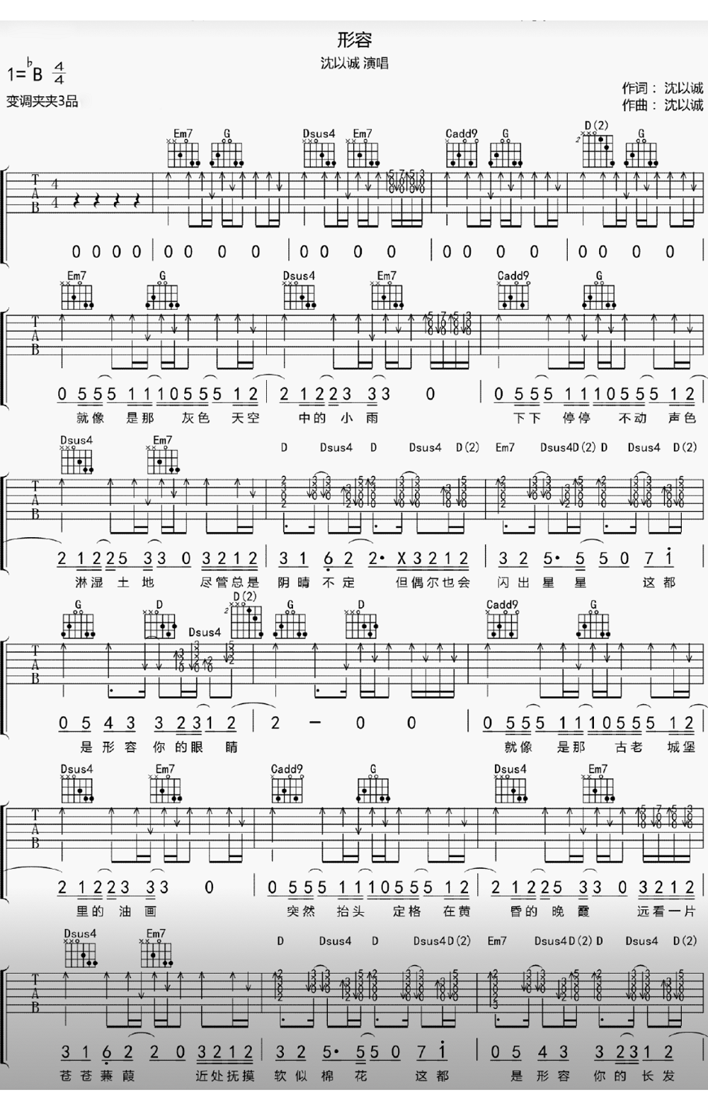 曲谱介绍: 沈以诚《形容》吉他弹唱谱,采用G调指法编配原版,共有4张高清图谱。