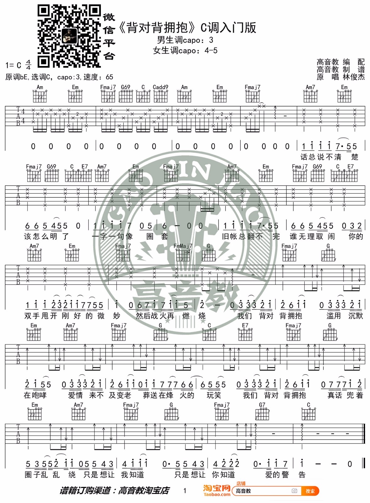 曲谱介绍: 林俊杰《背对背拥抱》吉他弹唱谱,采用C调指法编配,共有1张高清图谱,免翻页排版设计。