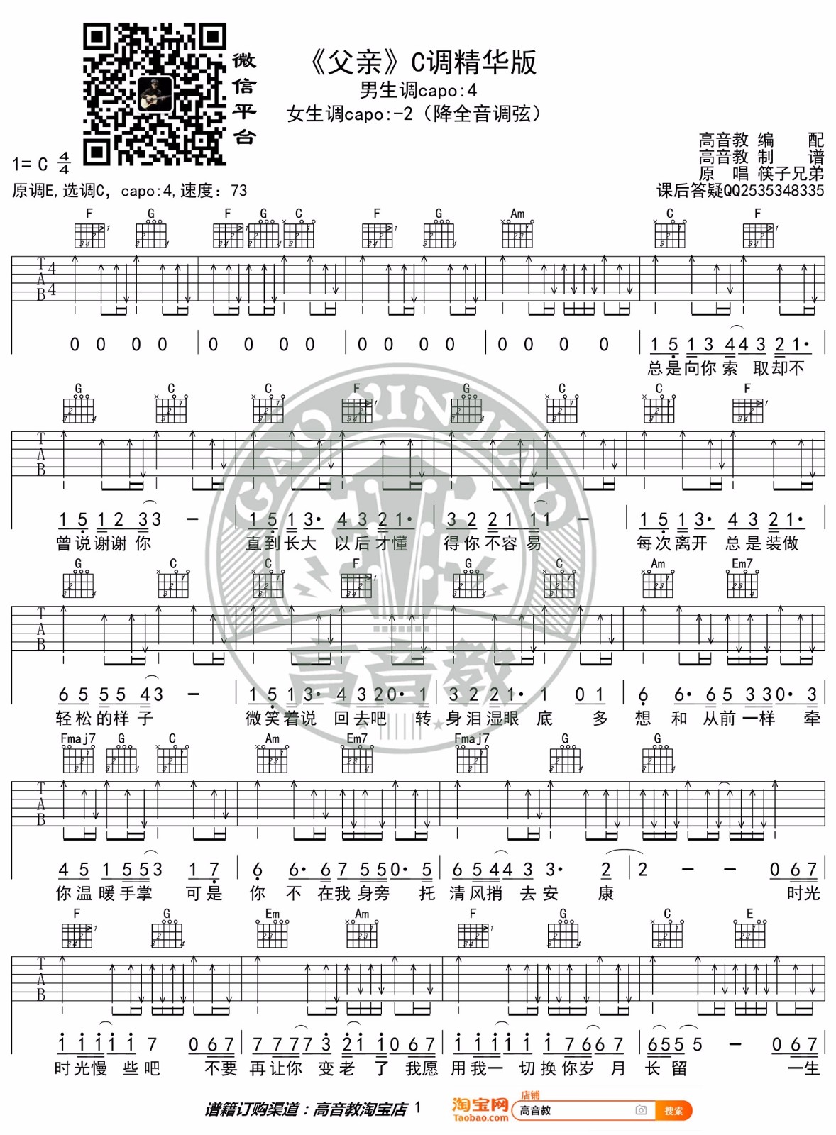 父亲吉他谱 - 筷子兄弟 - C调吉他弹唱谱