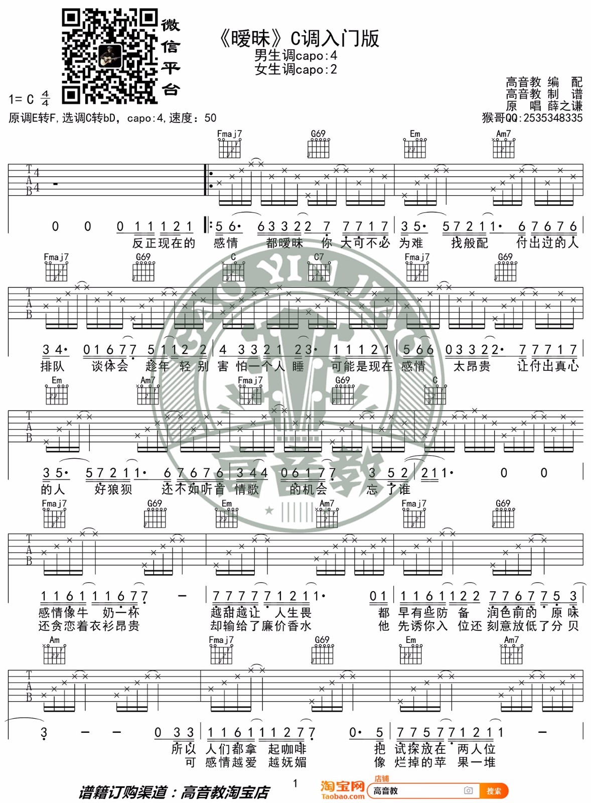 曲谱介绍: 薛之谦《暧昧》吉他弹唱谱,采用C调指法编配,共有2张高清图谱,免翻页排版设计。