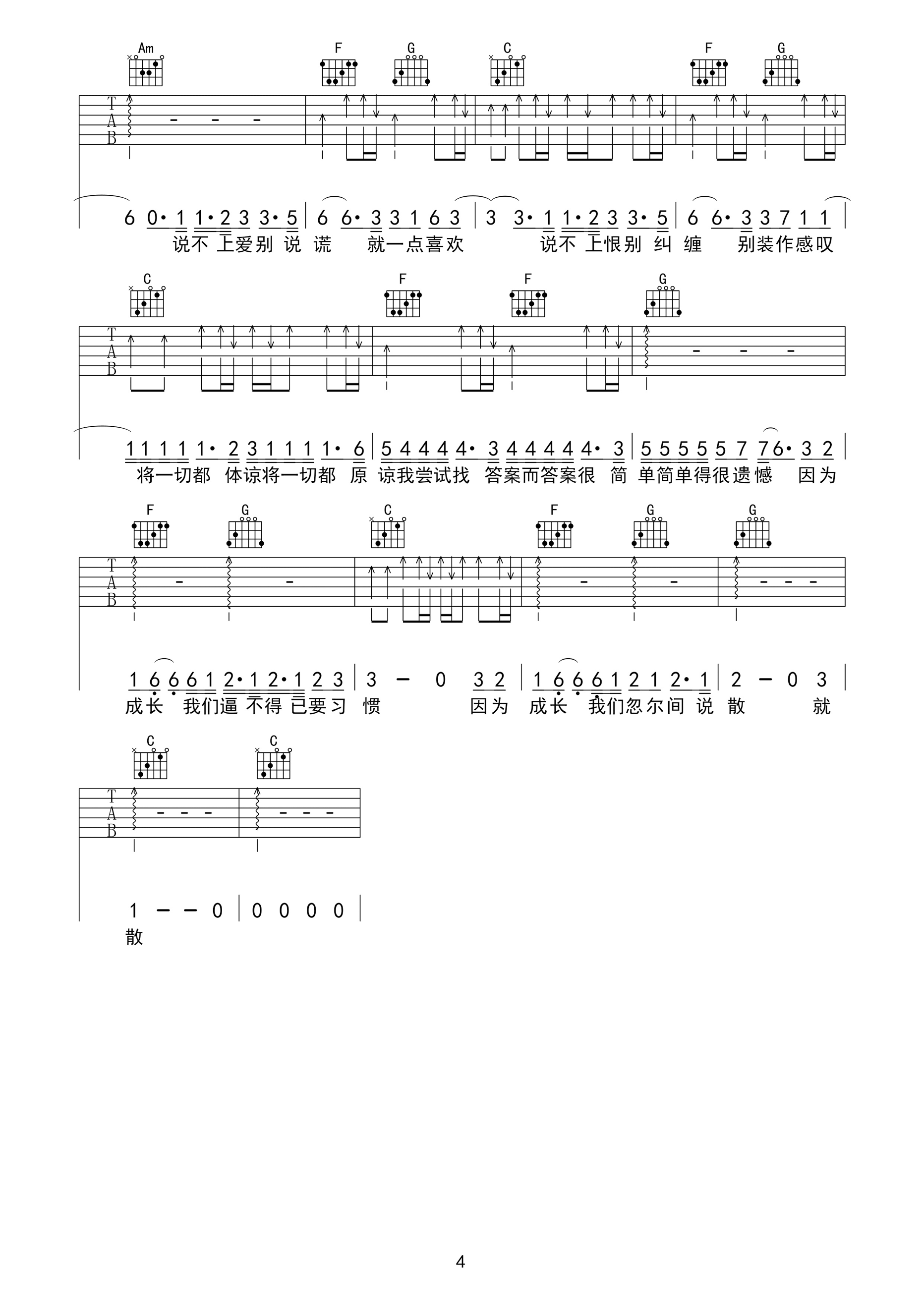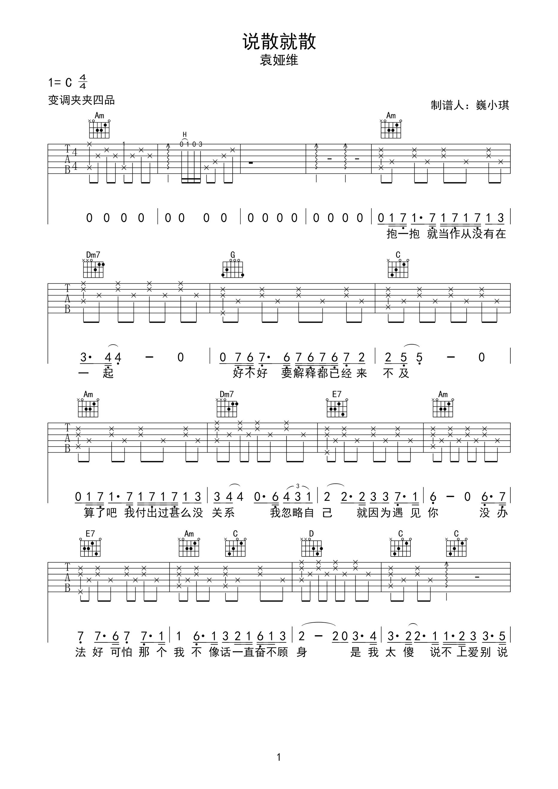 曲谱介绍: 袁娅维《说散就散》吉他弹唱谱,采用C调指法编配,共有4张高清图谱。