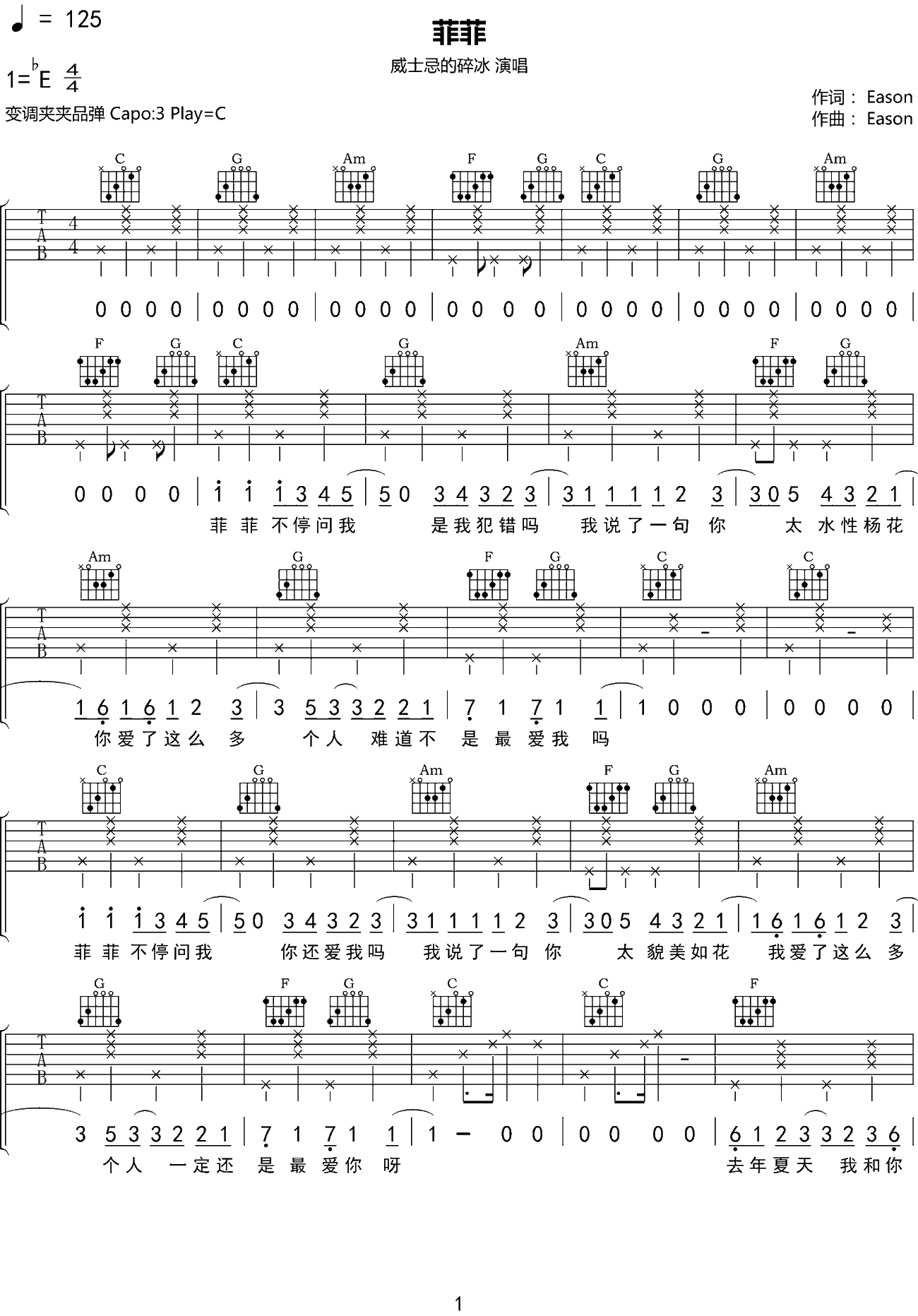 曲谱介绍: 沈以诚《菲菲》吉他弹唱谱,采用C调指法编配原版,共有4张高清图谱。