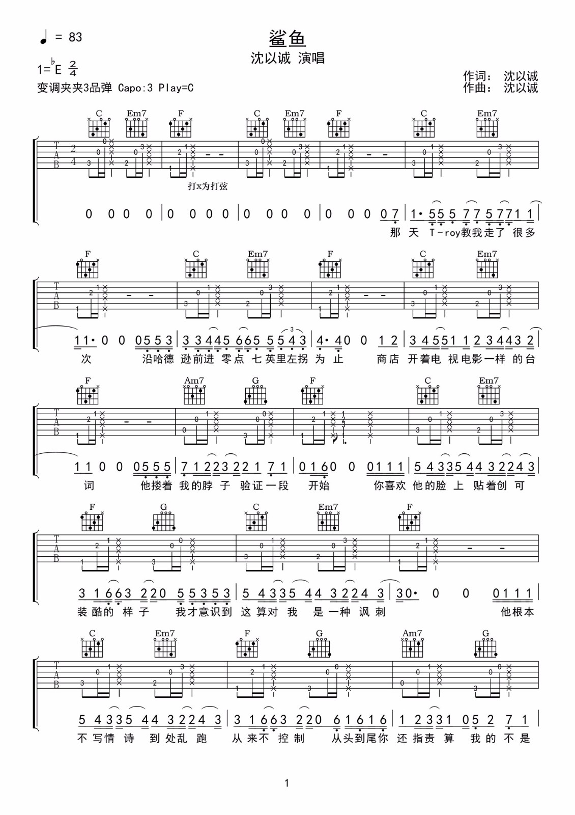 曲谱介绍: 沈以诚《鲨鱼》吉他弹唱谱,采用C调指法编配原版,共有4张高清图谱。