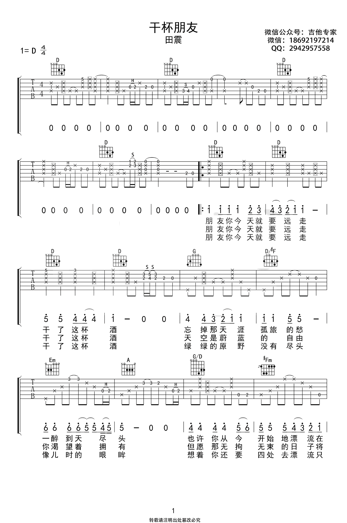 曲谱介绍: 田震《干杯朋友》吉他谱,由吉他专家制谱,《干杯朋友》吉他弹唱谱,选用D调指法,标准调音,根据自己嗓音条件调整变调夹位置,节奏4/4拍,难度初级简单。