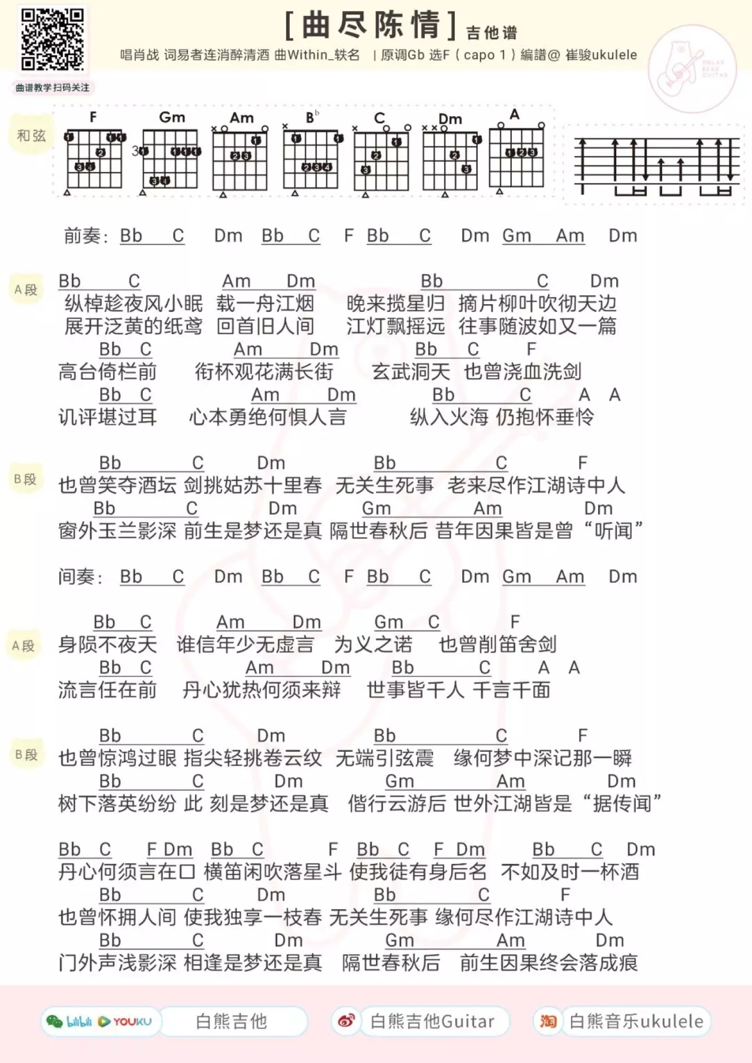曲谱介绍: 肖战《曲尽陈情》吉他弹唱谱,采用F调指法编配,共有2张高清图谱,免翻页排版设计。