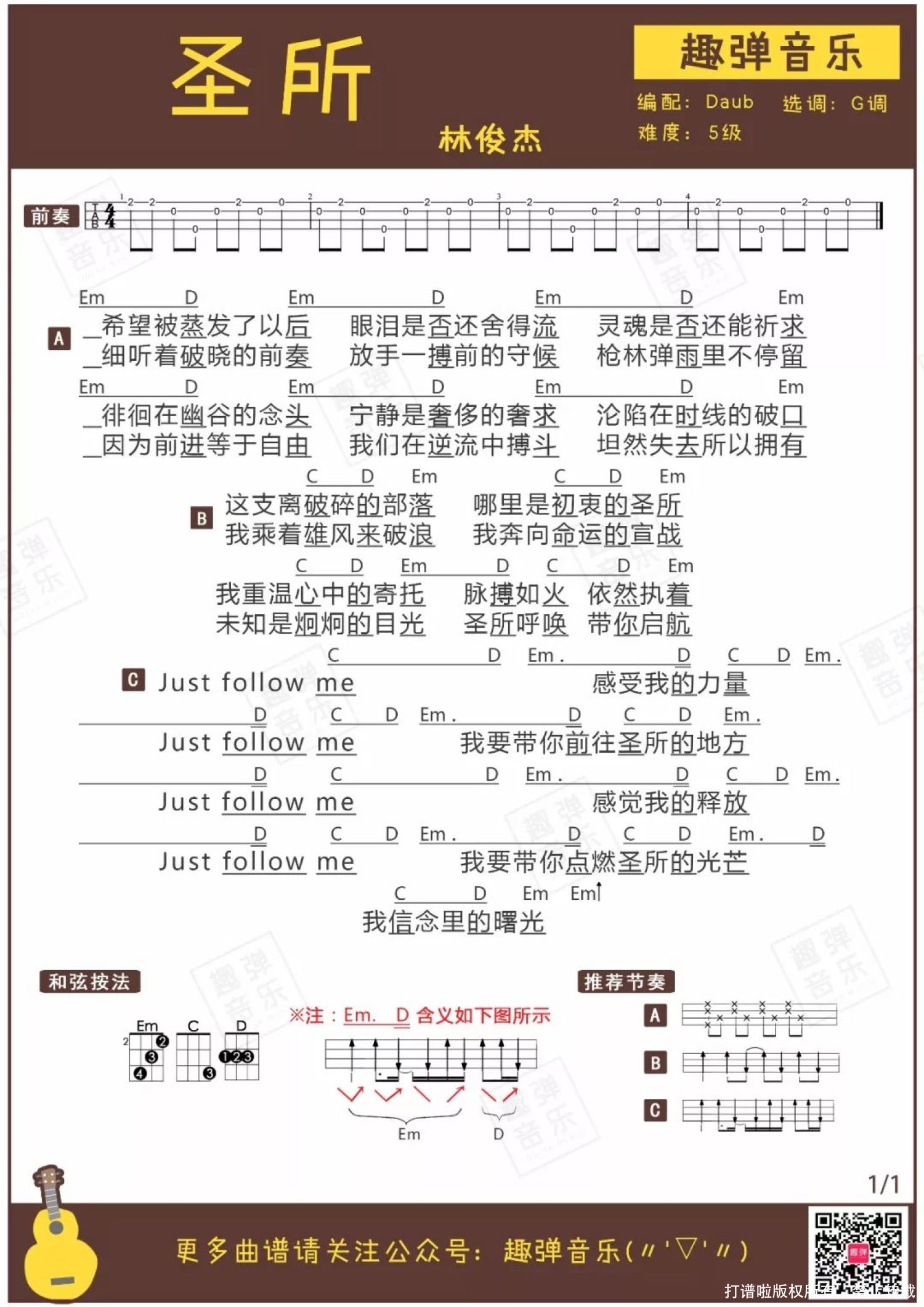 曲谱介绍: 《圣所》尤克里里谱 新专第一首歌,和老林以往的抒情歌曲不一样,是一首节奏感强烈的歌曲。旋律干净利落,《圣所》给人一种冲破黑暗的力量。 用接地气的方法夸它就是:听着这首歌走路会有一种走T台的感觉。