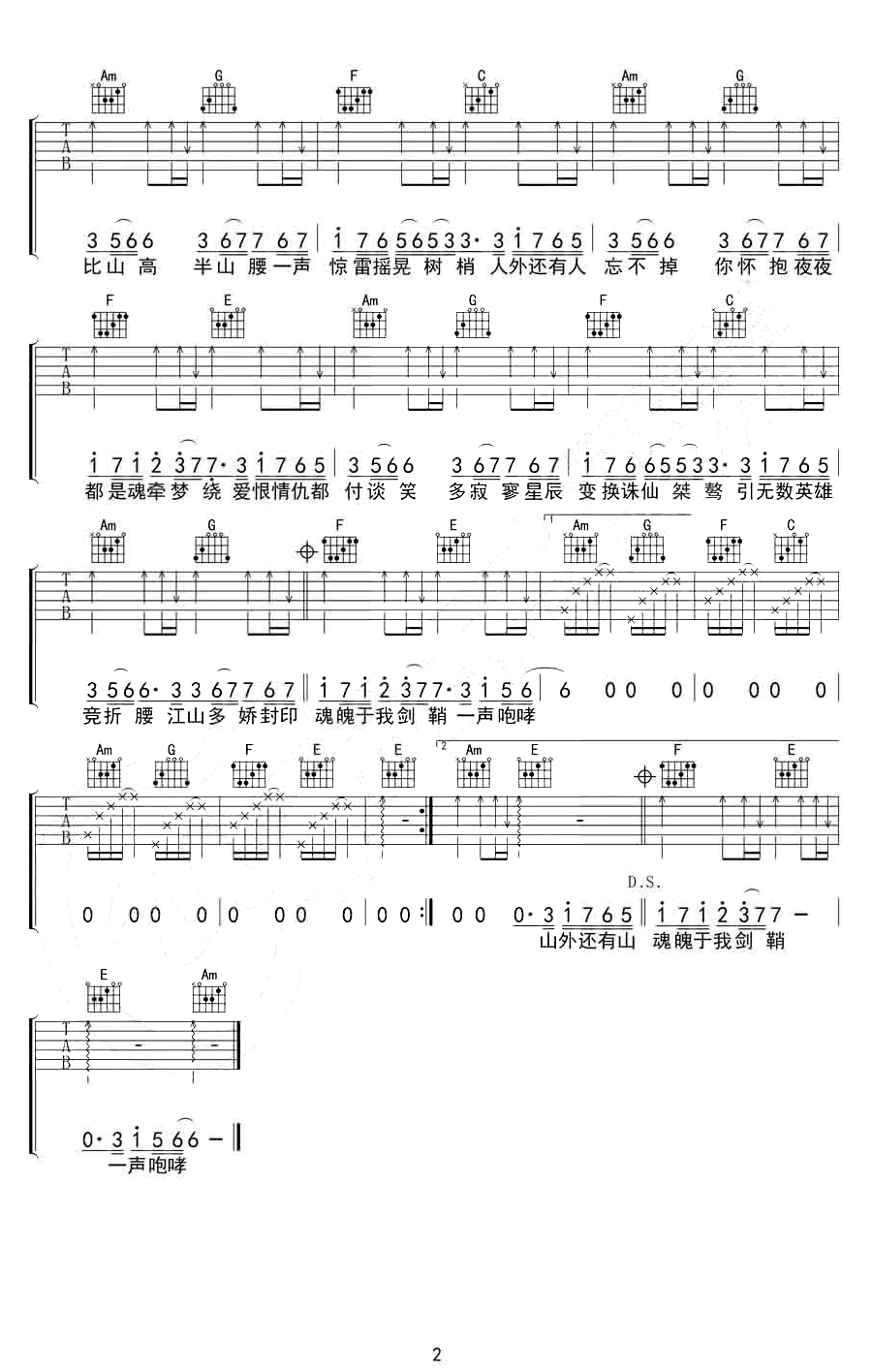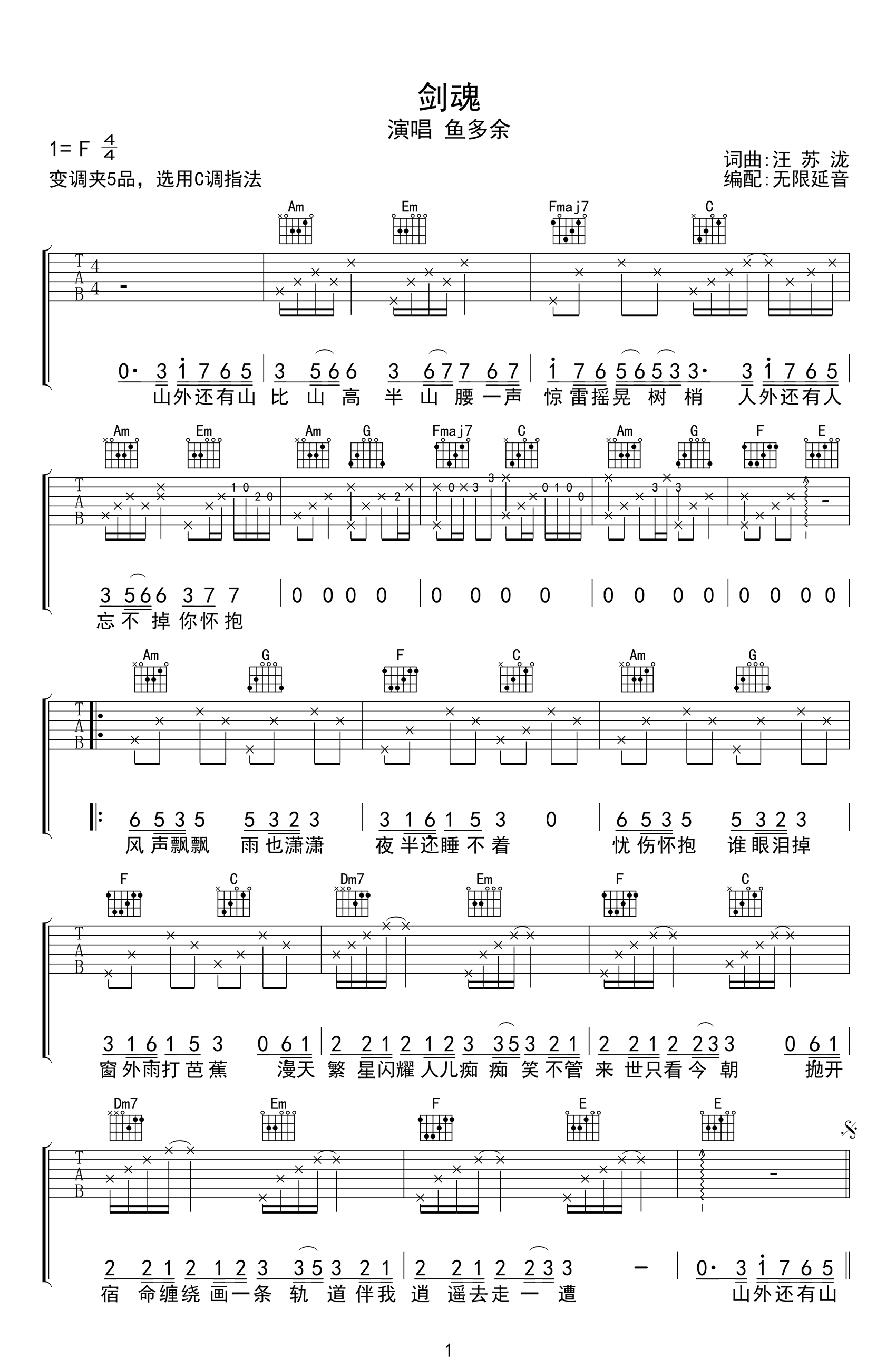 曲谱介绍: 鱼多余《剑魂》吉他弹唱谱,采用C调指法编配,共有3张高清图谱。