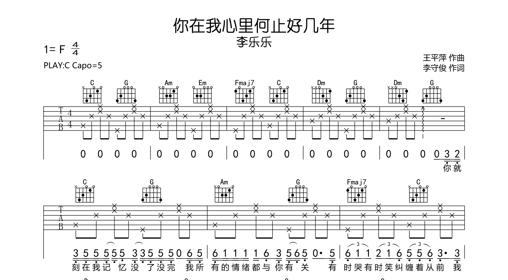 曲谱介绍: 李乐乐《你在我心里何止好几年》吉他弹唱谱,采用C调指法编配原版,共有2张高清图谱,免翻页排版设计。