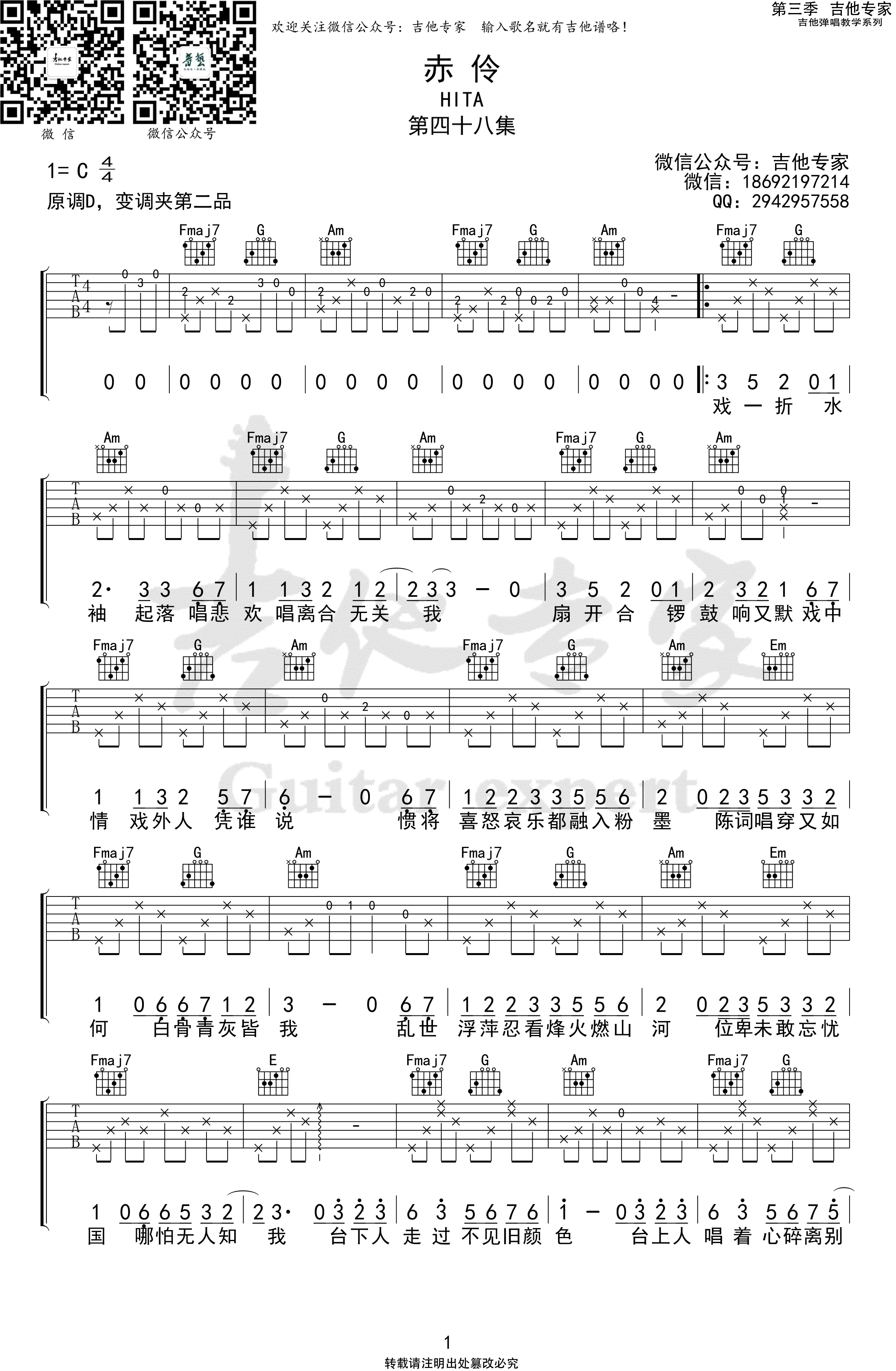 曲谱介绍: 赤伶吉他谱,HITA演唱的一首网络热门古风歌曲,赤伶吉他弹唱谱,原调D选调C,变调夹二品,两张图片六线谱,感谢吉他专家供谱,琴谱网整理上传。
