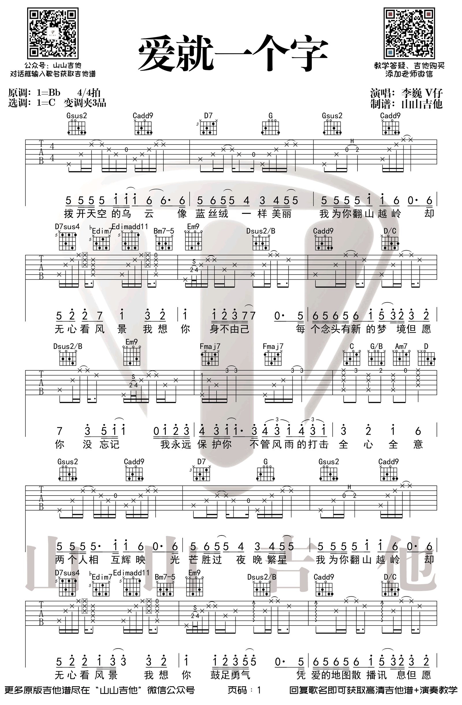 爱就一个字吉他谱 - C调吉他弹唱谱 - 原版