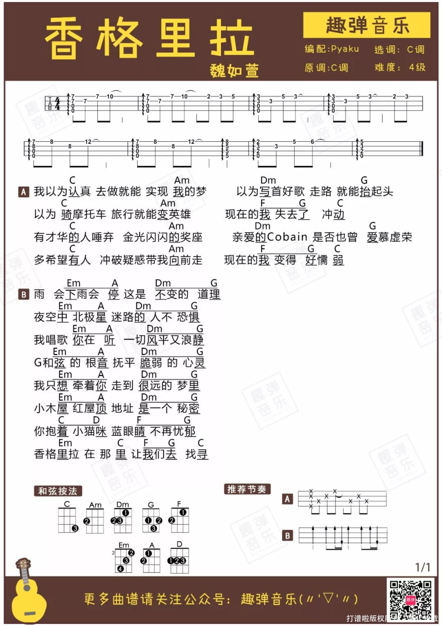 曲谱介绍: 《香格里拉》尤克里里弹唱谱 当结束一天的工作和学习,钻进温暖柔软的被窝,只属于自己的睡前时光终于开始了。 温柔安静的音乐总是能给身心洗去疲惫。忘掉一切烦恼忧愁吧,和枕边的Ukulele用一首好歌期待一场好梦如何? 别再熬夜啦,今天让趣弹君来哄你睡觉吧。给大家推荐一首轻柔舒缓的睡前歌曲:《香格里拉》。入睡前,用Ukulele给自己弹一首轻柔的晚安曲吧♪ 温柔干净的女声轻轻哼唱,听着这慢悠悠的旋律,自己好像化身成一只慵懒的猫咪,不知不觉就能坠入梦乡。 “香格里拉”代表了每个人心里最向往的地方和事物,是正在追寻的梦想。 在找寻梦想的路途中,一定会有疲惫和坎坷,所以千万别忘了身边平凡的小确幸,抱着心爱的猫咪饱饱地睡一觉,精力充沛后再继续前行吧。