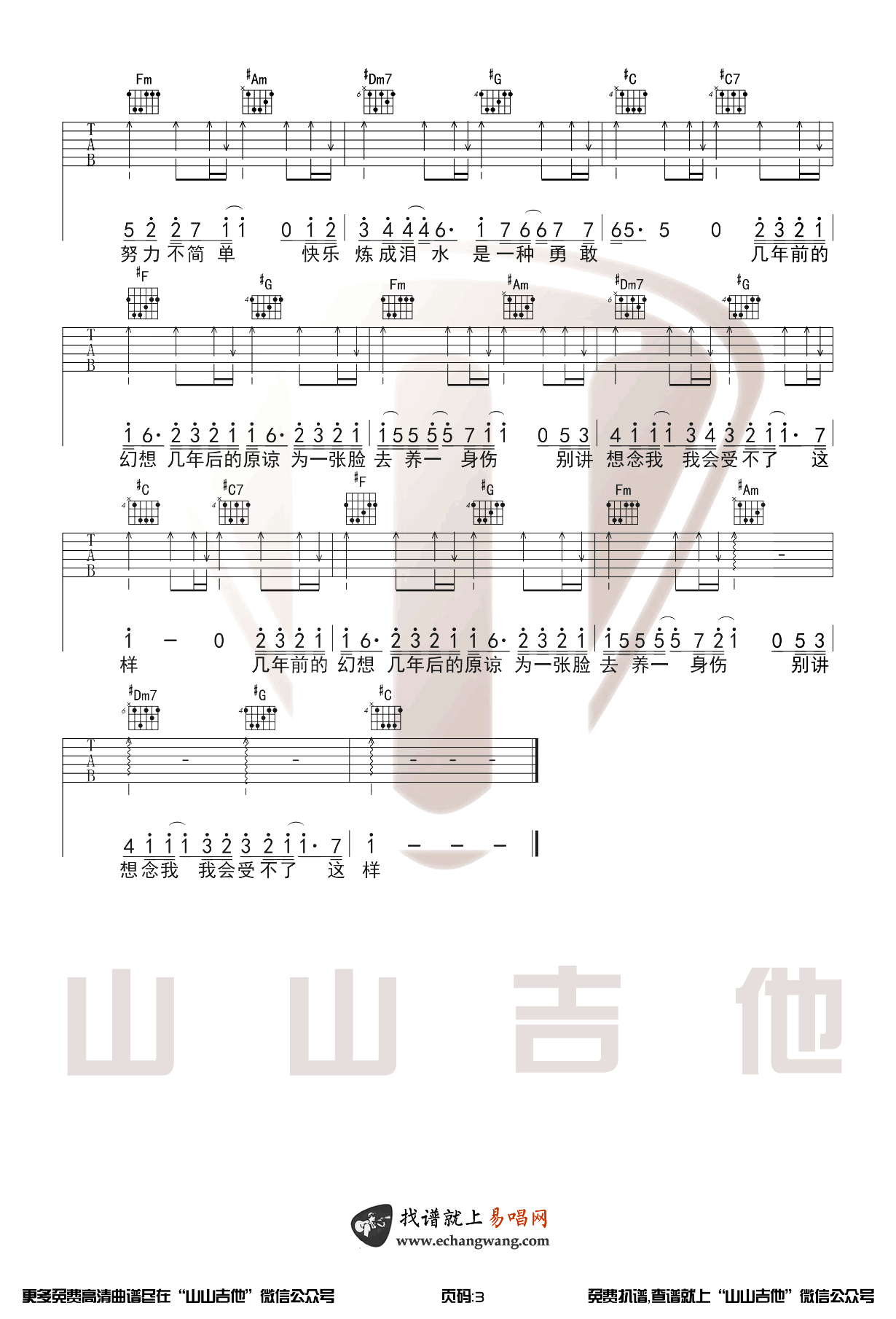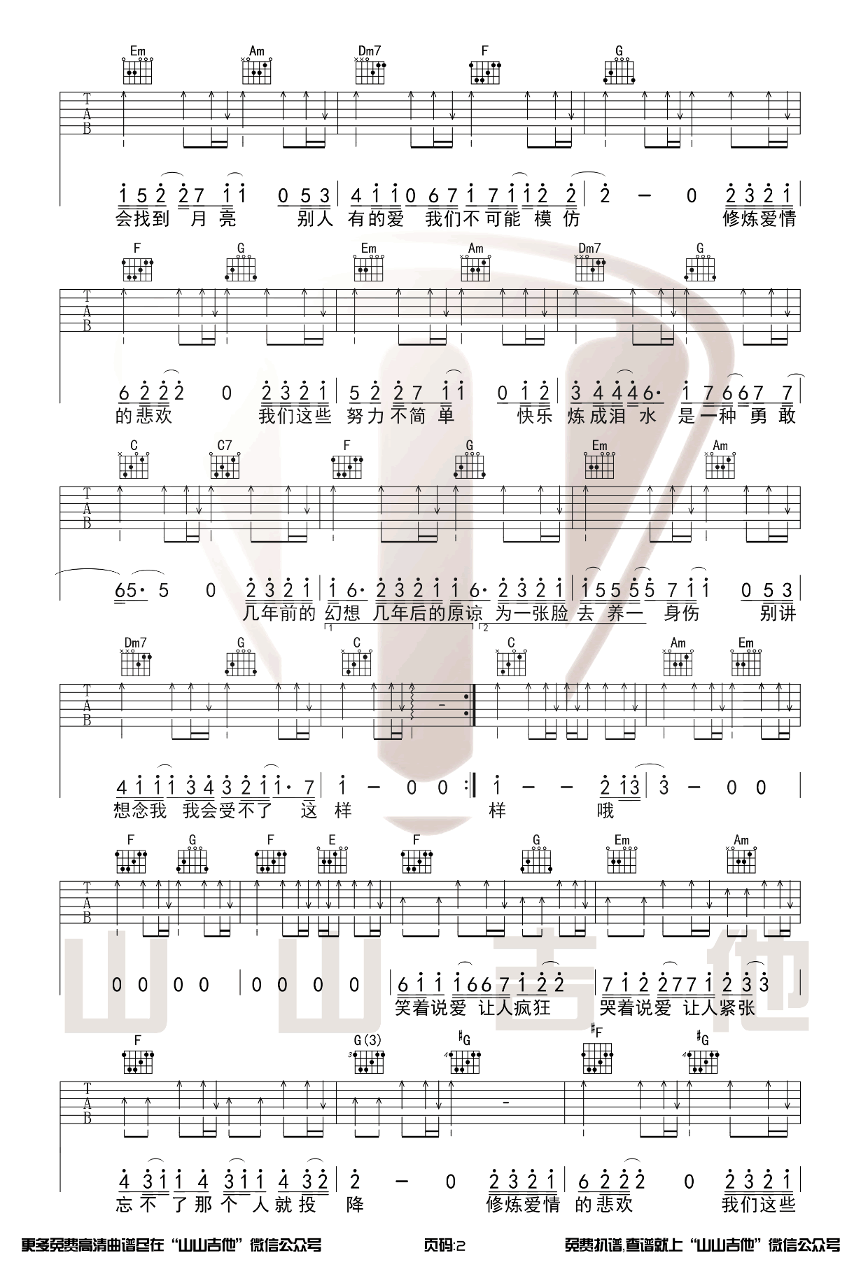 曲谱介绍: 修炼爱情吉他谱,林俊杰经典歌曲弹唱谱,修炼爱情吉他六线谱,C调指法编配,CAPO夹三品,三张图片谱,感谢山山吉他出品,琴谱网更新上传。