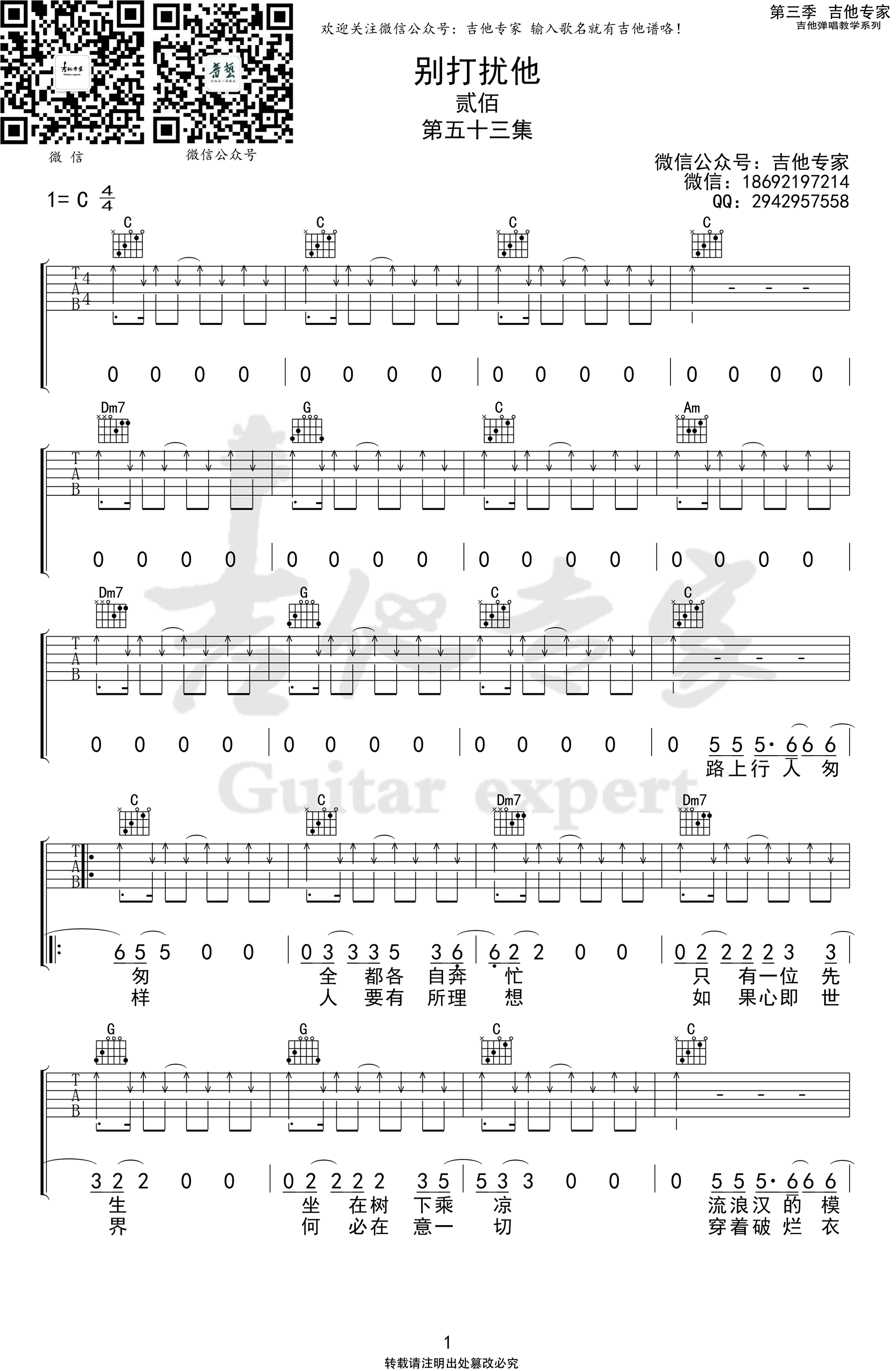 曲谱介绍: 别打扰他吉他谱,贰佰演唱的一首适合吉他弹唱的民谣歌曲。别打扰他六线谱,C调编配,三张高清图片谱,感谢吉他专家出品,琴谱网更新上传。