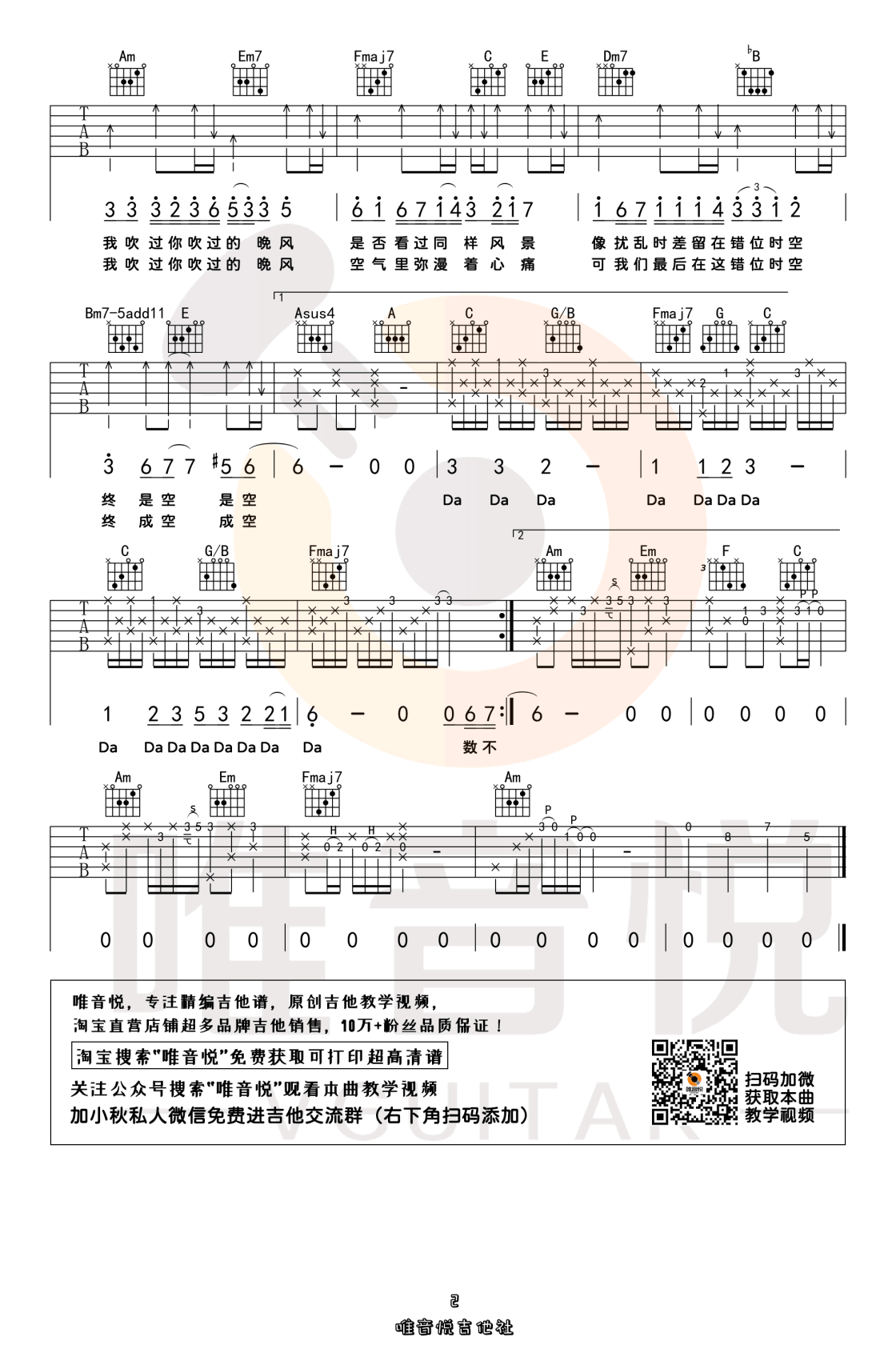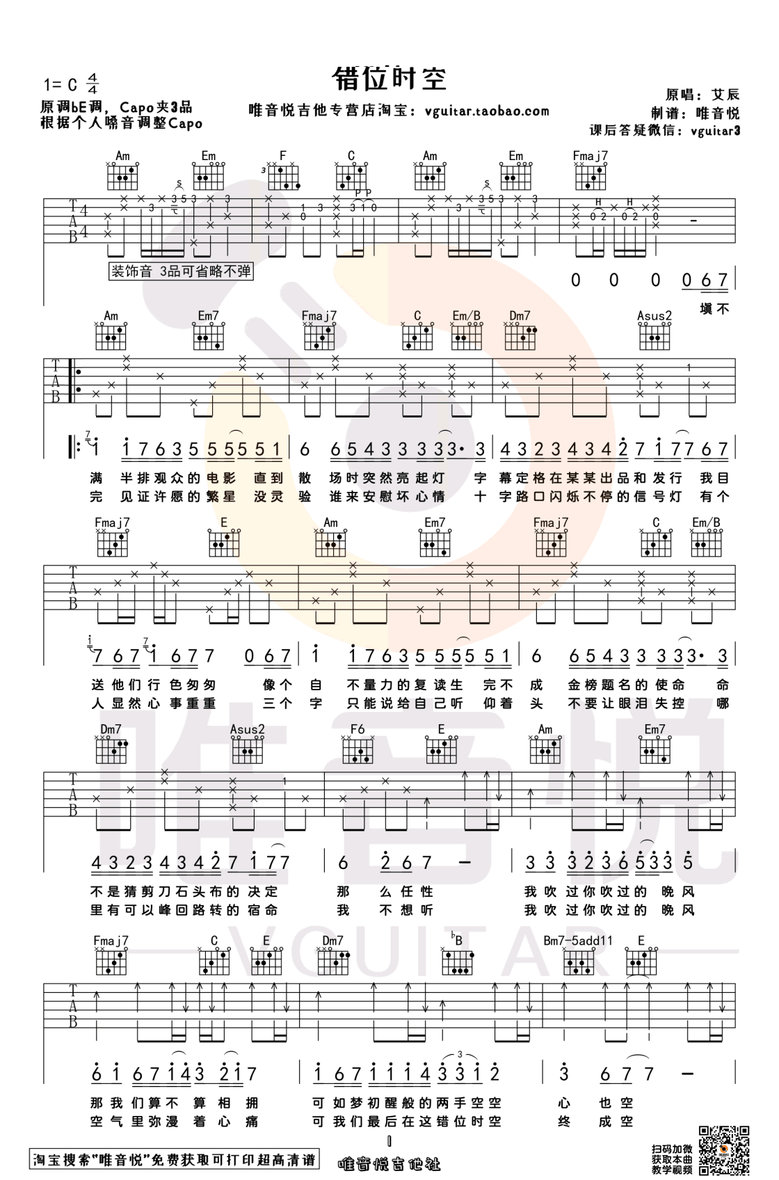 曲谱介绍: 错位时空吉他谱,艾辰演唱的一首网络热门歌曲。错位时空吉他弹唱谱,选用C调指法编配,变调夹夹三品,也可以根据个人嗓音调整CAPO。琴谱网感谢唯音悦制谱分享。