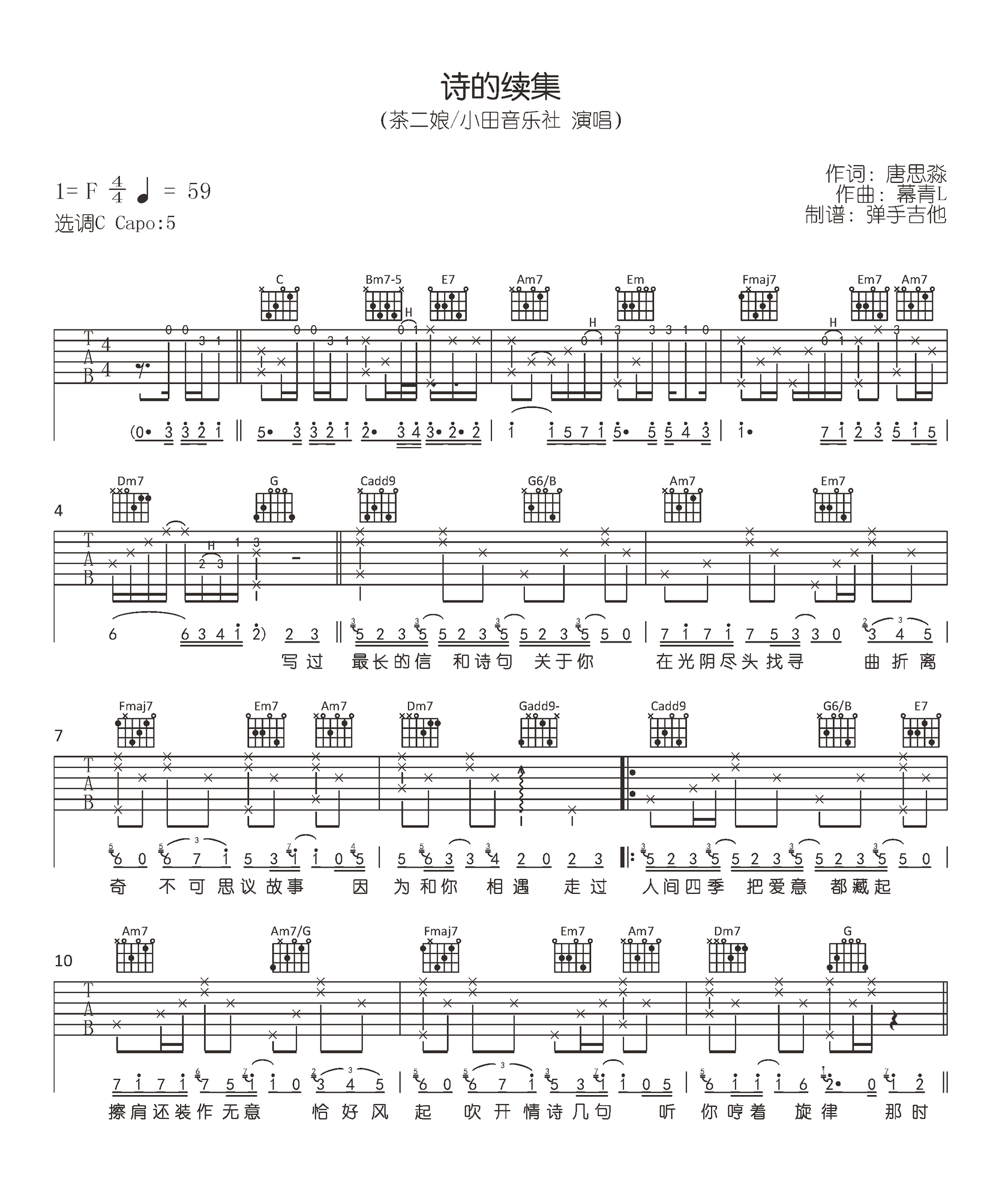 诗的续集吉他谱 - 茶二娘/小田音乐社 - C调吉他弹唱谱 - 原版