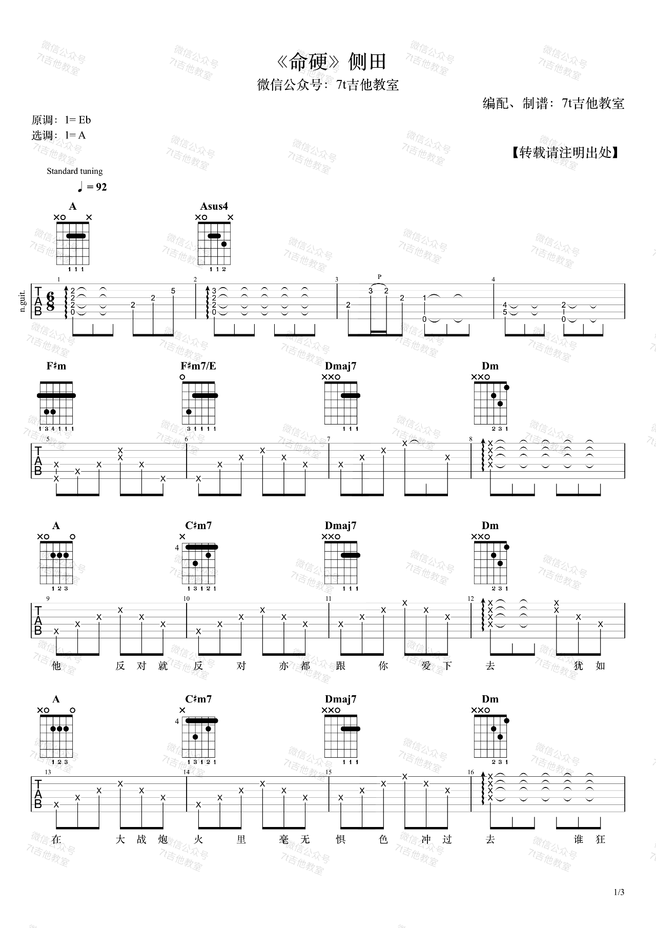 曲谱介绍: 命硬吉他谱,侧田演唱的粤语歌曲,原调是Eb大调,用的是A大调的指法来编配(视频里是标准音调弦,没有使用变调夹)。如果想弹原调需要夹第6品。7T吉他教室编配,琴谱网吉他谱上传更新。 和弦分析:主歌部分用了四级小和弦Dm,这里的 4 → 4m 是比较常见的用法。「谁狂怒,谁拦路……」这一句 F#m → F#m/F → F#m/E → D#m7-5 用了升四级半减七和弦的经典用法。主歌和副歌都用了 A → E/G# → F#m7 → F#m7/E → Dmaj7 这一个低音下行的和弦连接。