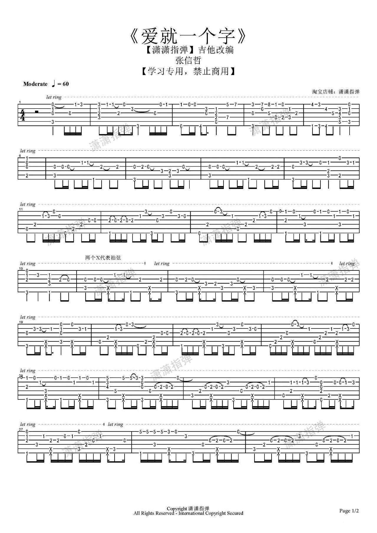 爱就一个字吉他谱 - 张信哲 - 吉他独奏谱