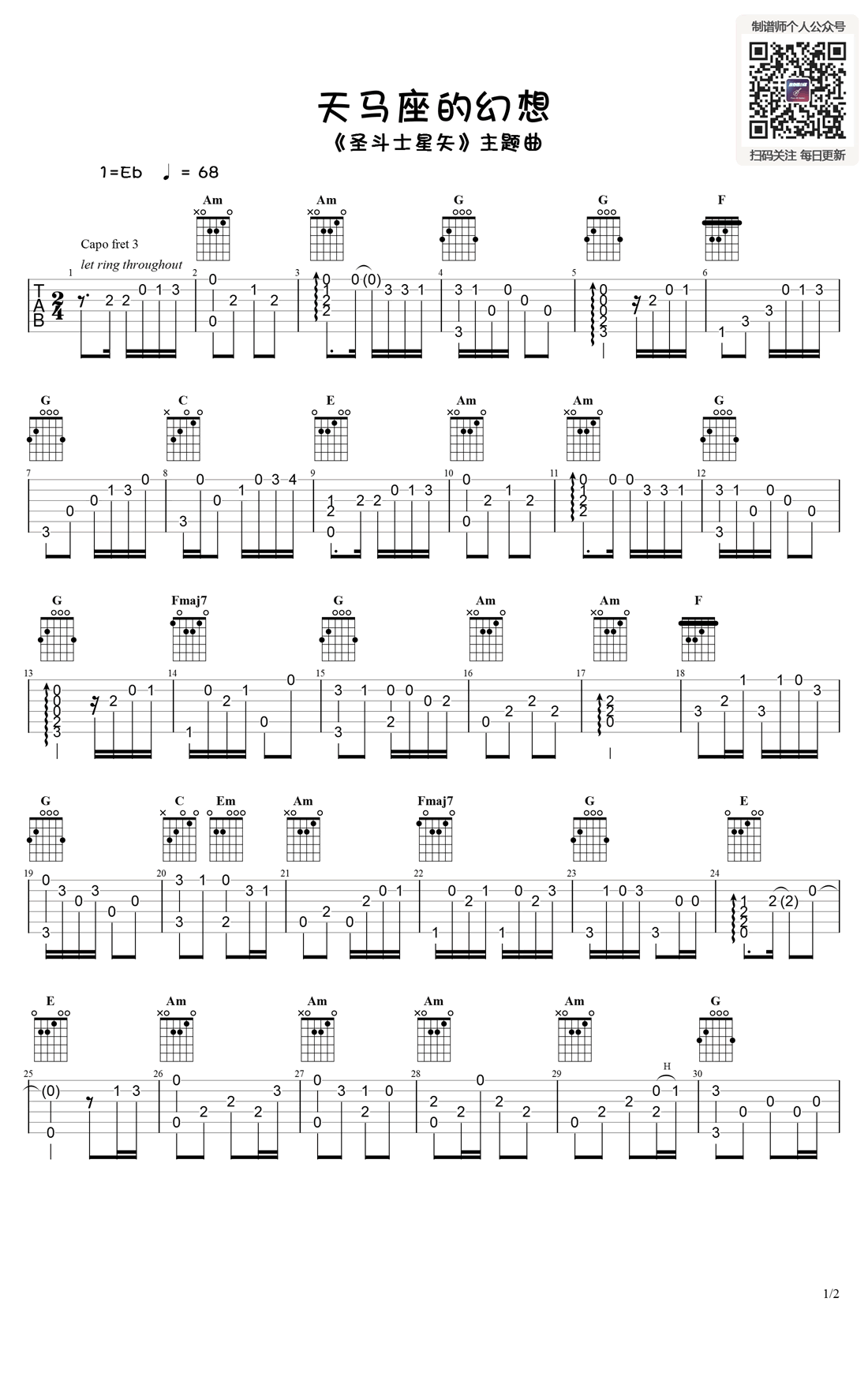 曲谱介绍: 天马座的幻想指弹吉他谱,日本动漫《圣斗士星矢》主题曲,令80后怀念和感动的儿时回忆的旋律。天马座的幻想吉他独奏谱,Capo夹三品,两张图片谱例,弹吉他的勺子分享,琴谱网整理更新。
