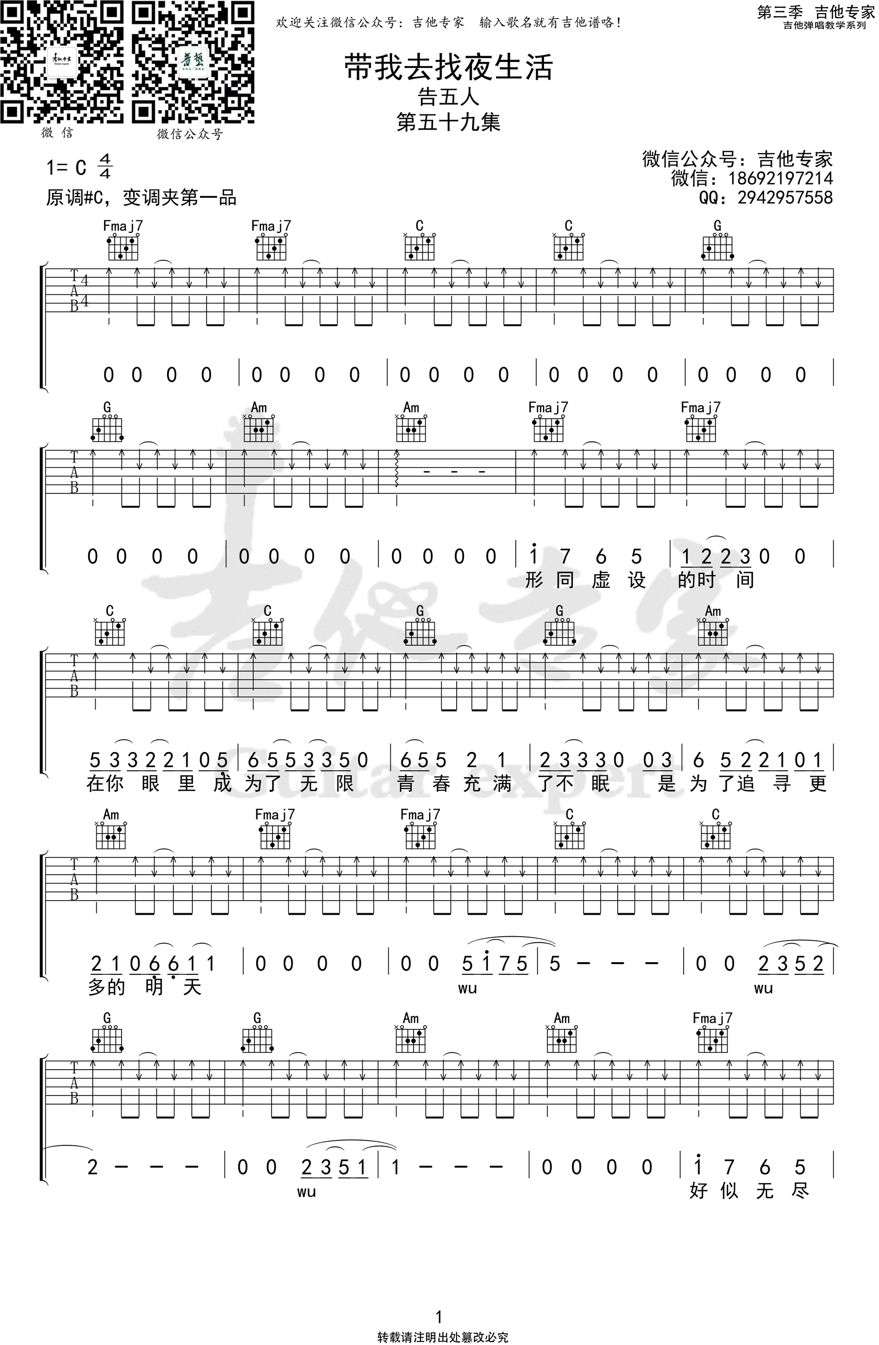 曲谱介绍: 《带我去找夜生活》吉他谱,告五人演唱,C调弹唱谱,变调夹夹一品,带我去找夜生活六线谱,完整版共四张高清图片谱例。感谢吉他专家制谱出品,琴谱网上传分享。