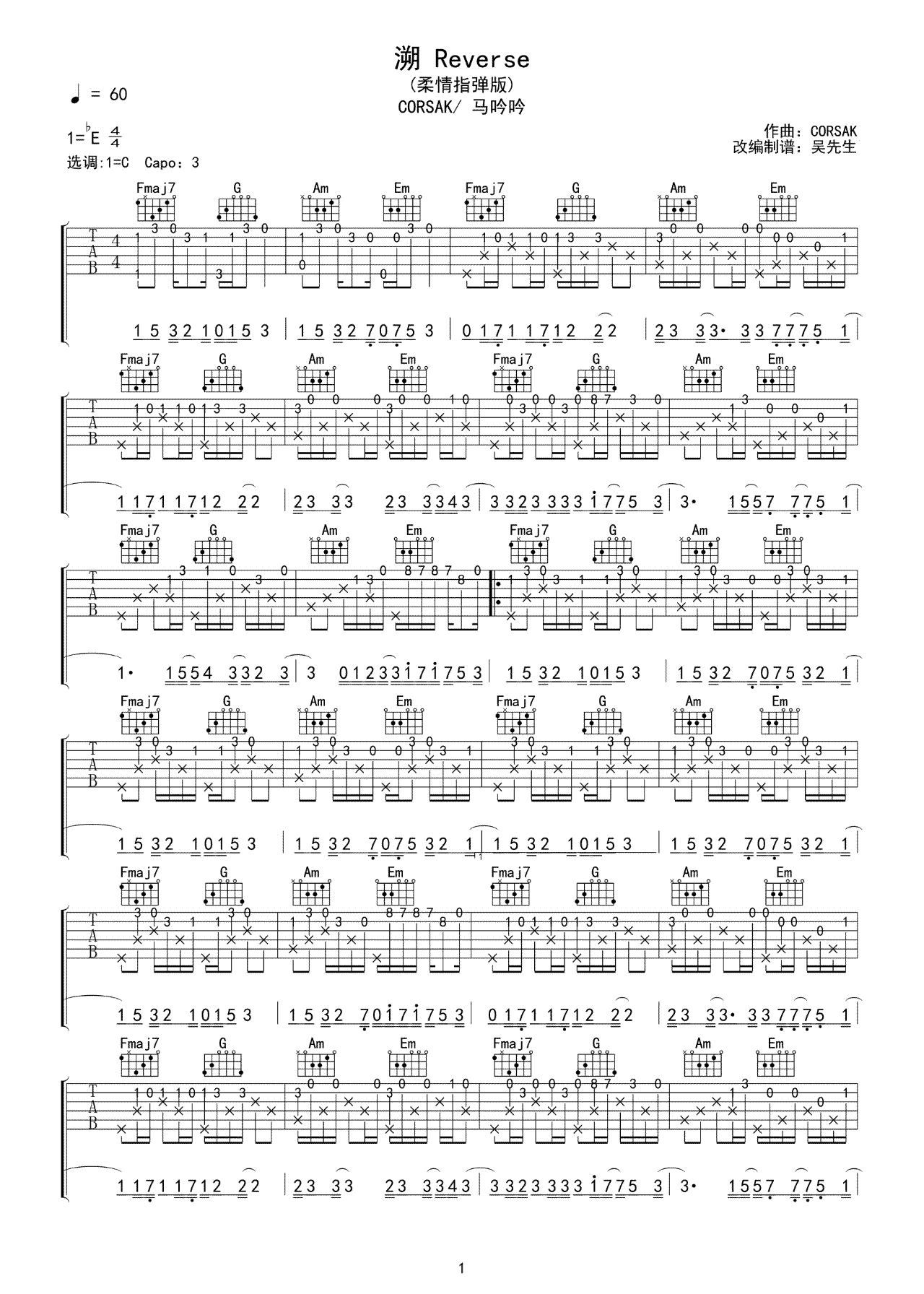 曲谱介绍: 《溯》吉他指弹谱,CORSAK胡梦周/马吟吟演唱,溯吉他独奏谱,柔情指弹版,选用C调指法,变调夹夹一品,两张图片谱。吴先生TAB编配分享,琴谱网整理上传。