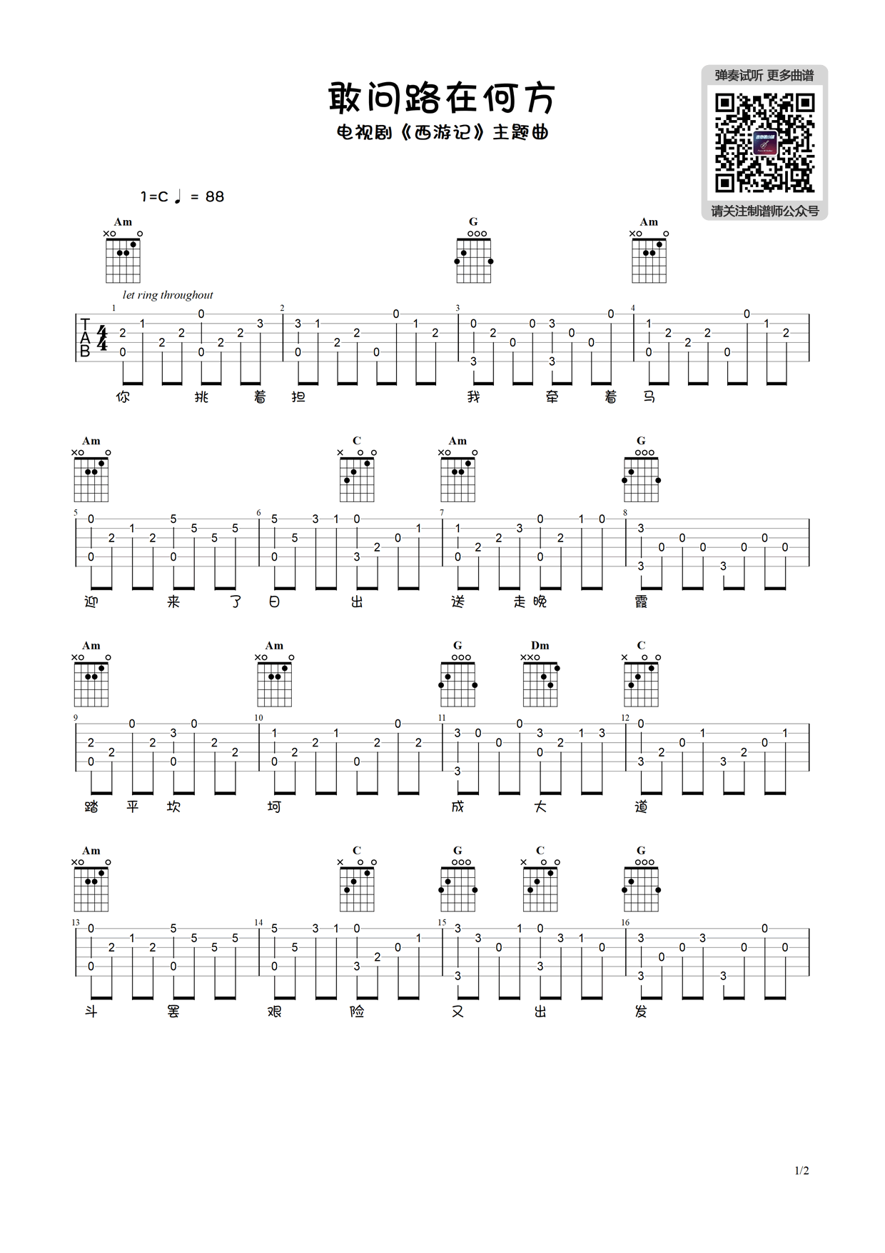 曲谱介绍: 敢问路在何方指弹谱,根据央视经典电视剧《西游记》主题曲改编;敢问路在何方吉他独奏谱,C调,两张图片谱例。制谱师分享琴谱网更新。