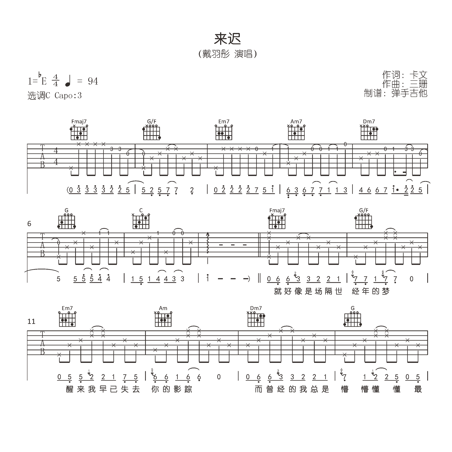 曲谱介绍: 来迟吉他谱,戴羽彤演唱的一首抖音热门歌曲,来迟吉他六线谱,原调选调C,变调夹夹第二品,完整版共三张高清图片谱例。琴谱网整理上传。