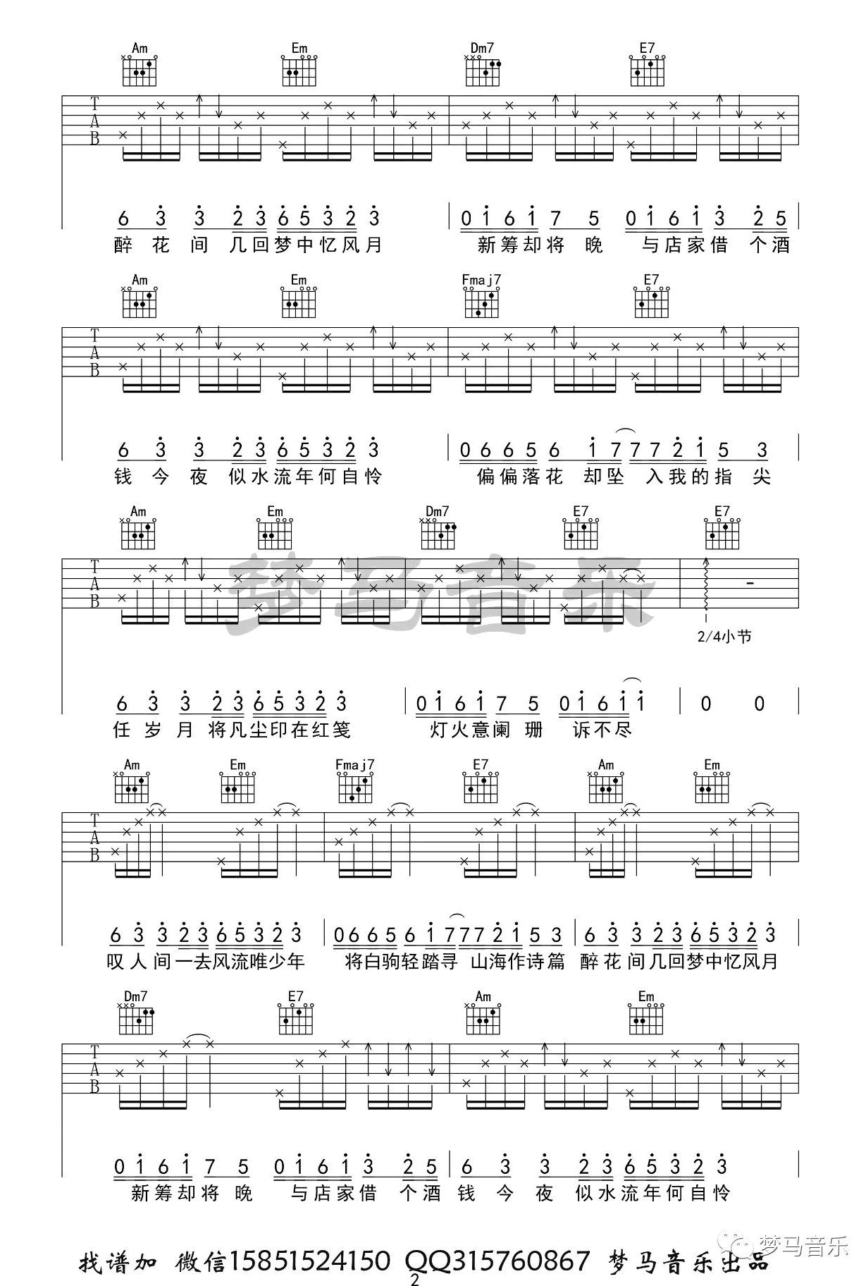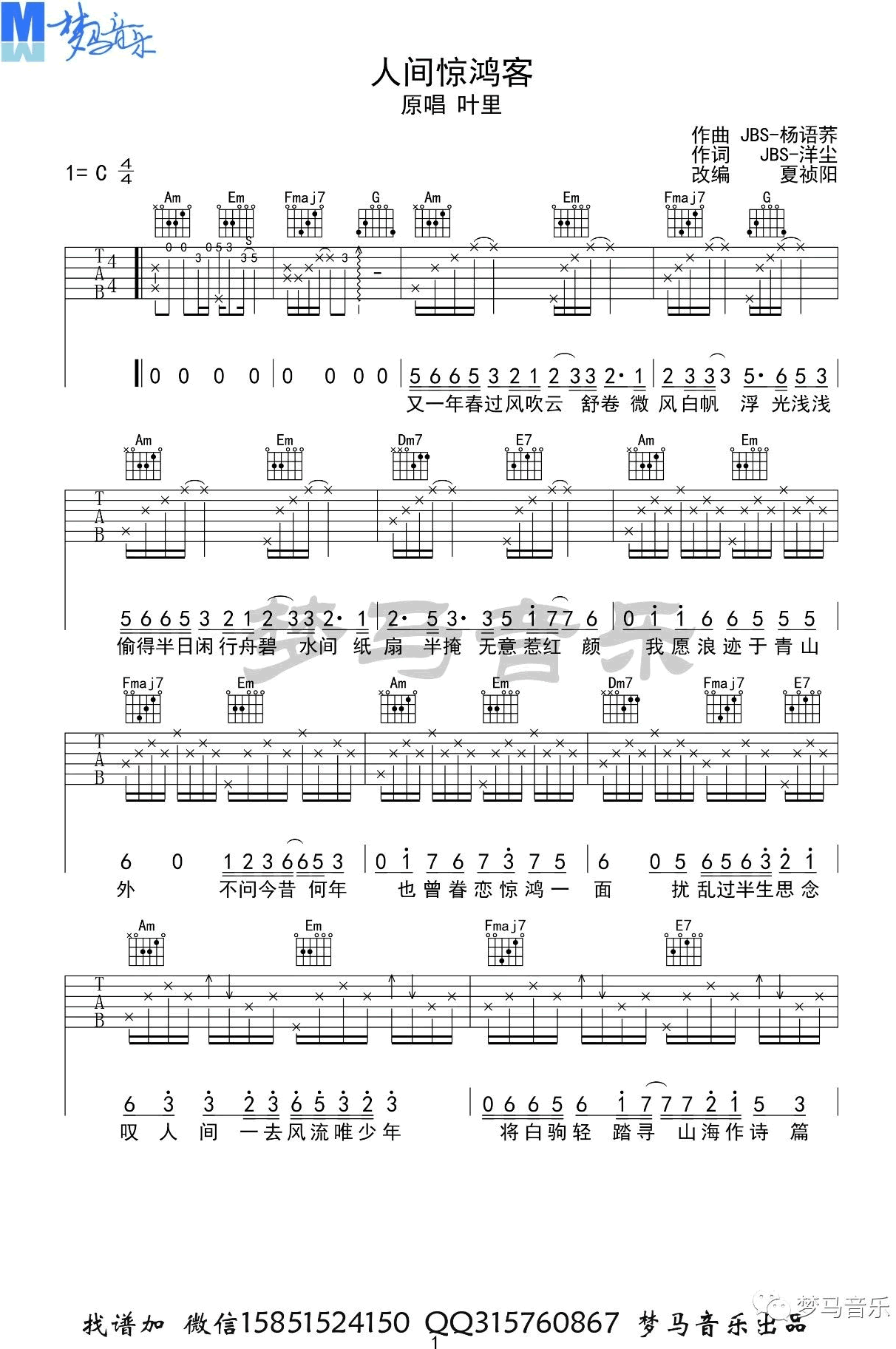 曲谱介绍: 人间惊鸿客吉他谱,叶里演唱,一首好听的古风歌曲,人间惊鸿客六线谱,C调编配,三张图片谱例。梦马音乐制谱分享,琴谱网更新上传。