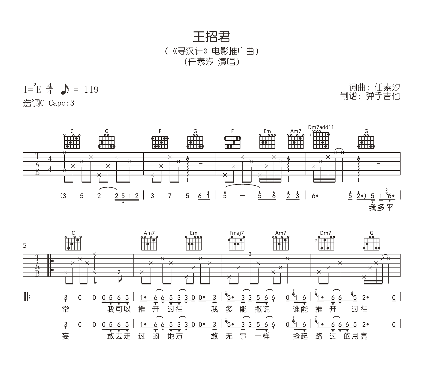曲谱介绍: 王招君吉他谱,任素汐演唱,电影《寻汉计》推广主题曲。王招君吉他六线谱,原调降E,选调C,变调夹夹第三品。完整编配版本共三张高清图片谱。琴谱网收藏推荐。