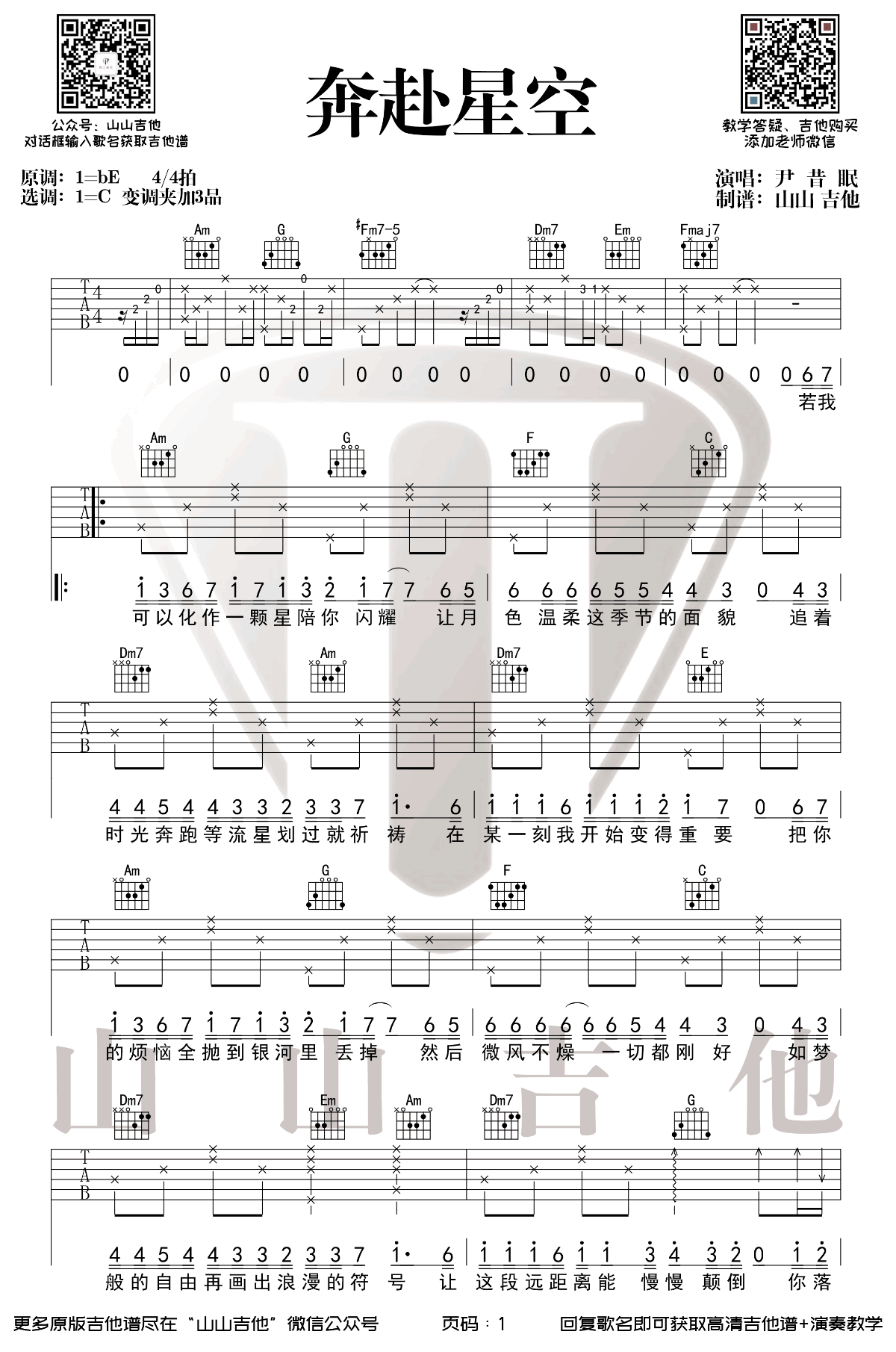 曲谱介绍: 奔赴星空吉他谱,尹昔眠演唱的这首好听的歌曲冲上热门排行榜,奔赴星空吉他六线谱,原调降E选用C调指法,变调夹三品,两张图片谱例,配套吉他弹唱演示视频,琴谱网更新上传,山山吉他制谱分享。 编配演奏说明:前奏有一个F小7减5和弦对于初学者来说有些困难,但是主歌和副歌的和弦就是比较简单的常用和弦了。在副歌部分配合歌曲的情绪的加强我们编配了扫弦,节奏型使用了比较常见的前八后十六。贴合原曲,同时对初学者来说还算比较友好,对于正在学习扫弦的同学来说是很好的练习曲。
