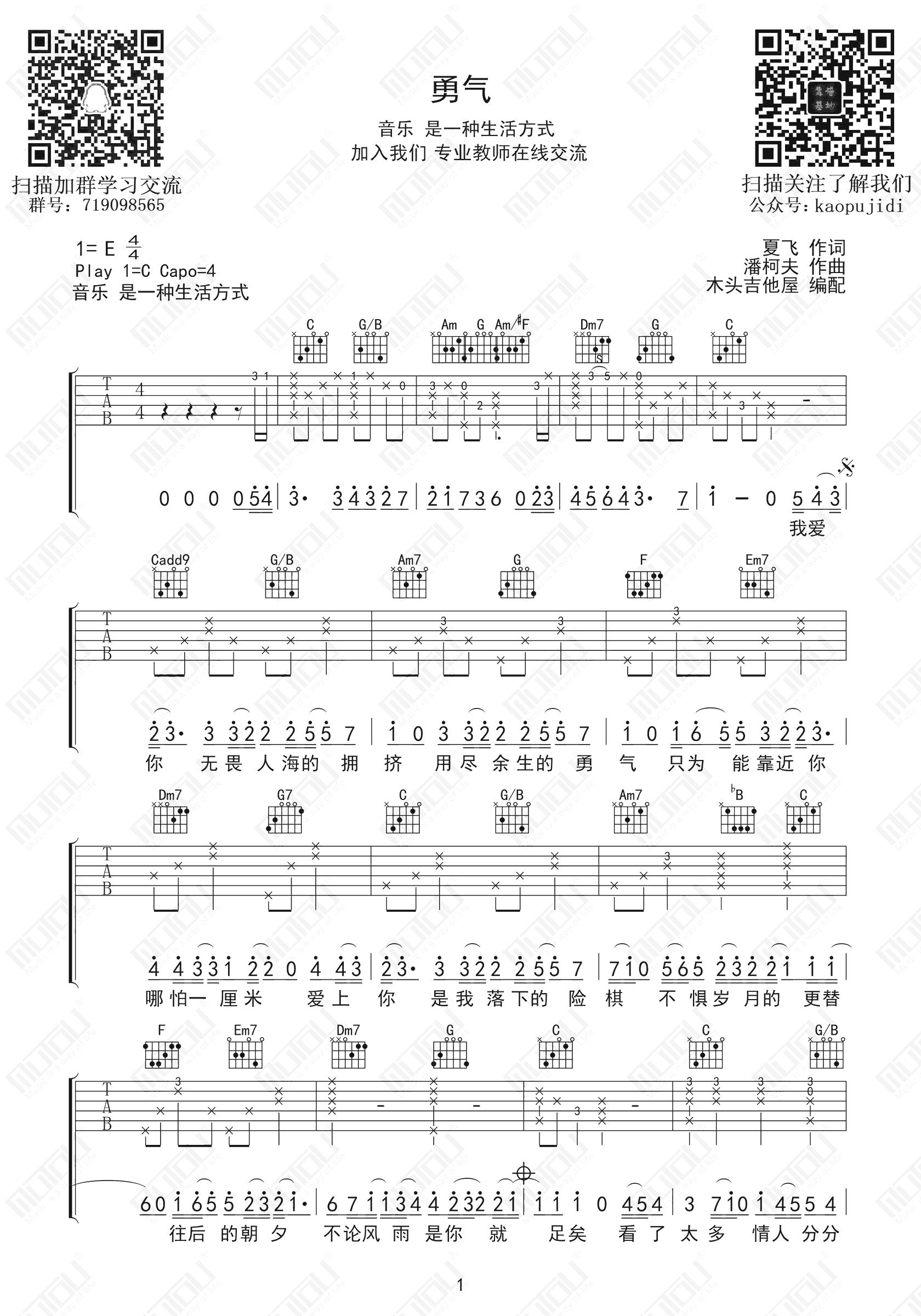 曲谱介绍: 勇气吉他谱,棉子的一首深情且动听让人忍不住单曲循环的网络热门歌曲。勇气六线谱,原调E选用C调,变调夹夹四品,三张图片谱例,琴谱网感谢木头吉他屋编配出品。