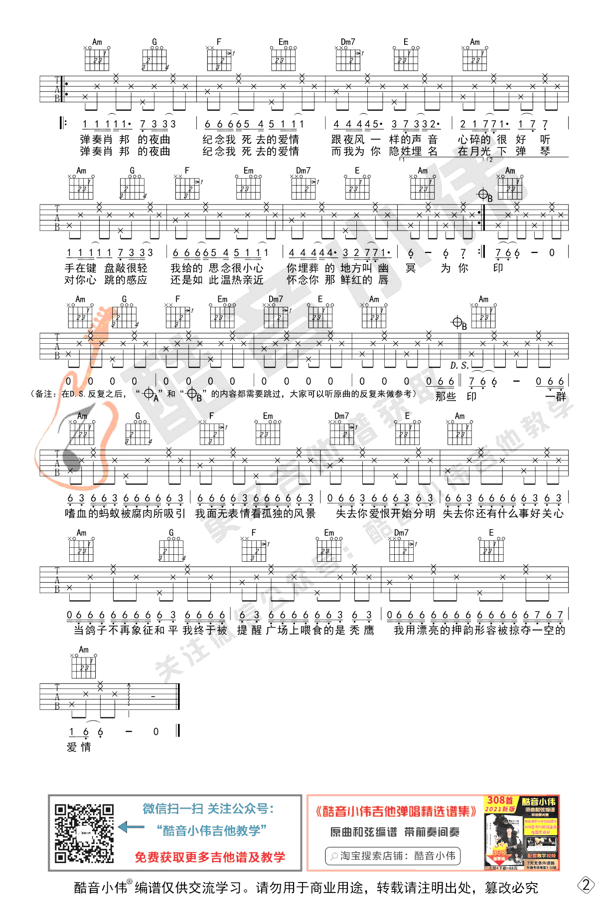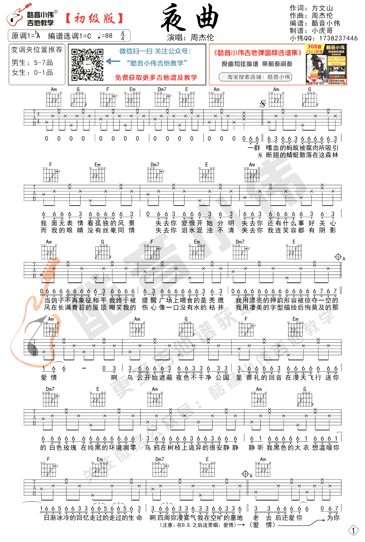 曲谱介绍: 夜曲吉他谱,周杰伦的一首经典老歌。夜曲六线谱,原调降A,选用C调,初级版编配,变调夹推荐,男生5-7品,女生0-1品,两张图片谱例。感谢酷音小伟制谱分享,琴谱网整理上传。