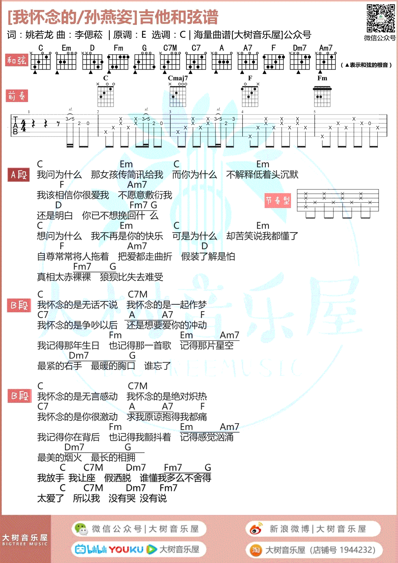 曲谱介绍: 我怀念的吉他谱,孙燕姿演唱的一首经典代表歌曲,我怀念的吉他弹唱谱,原调E调,选用C调弹奏,变调夹夹四品,六线谱+和弦图片谱,大树音乐屋编配出品,琴谱网吉他谱上传更新。