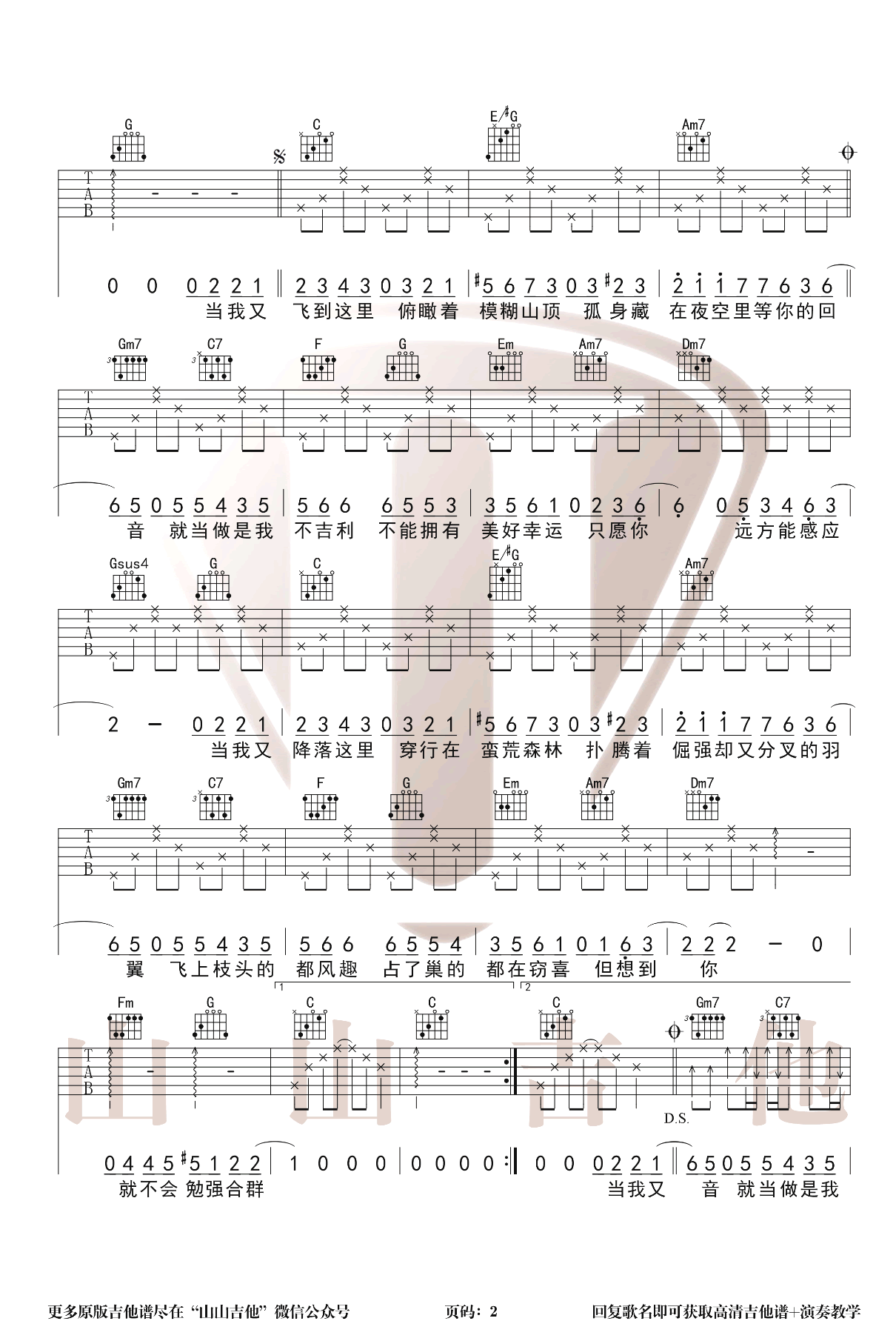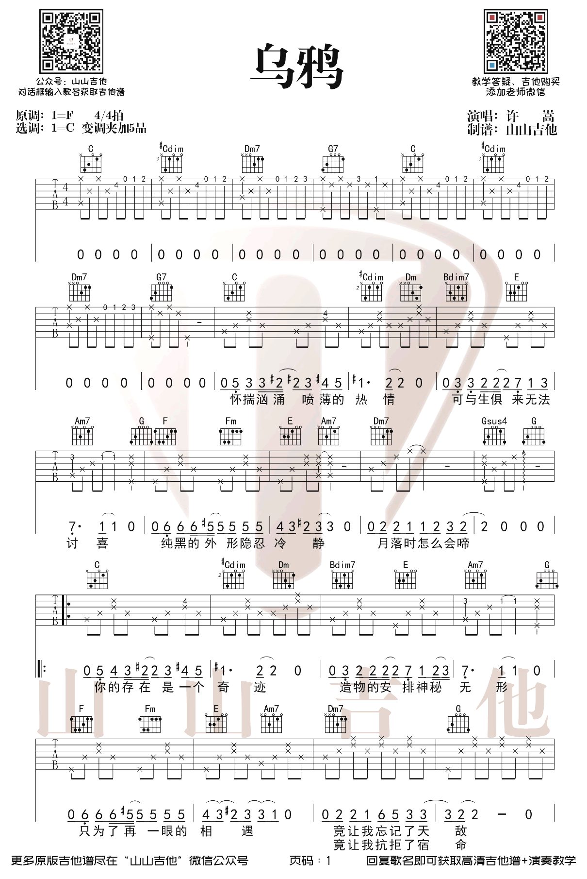 曲谱介绍: 乌鸦吉他谱,许嵩新歌,悲伤温柔又很治愈。乌鸦吉他六线谱,原调F选调C,变调夹夹五品。两张弹唱图片谱。山山吉他编配,琴谱网上传分享。 曲谱大部分是常用和弦,有几个大横按,节奏部分很简单,使用到了八分音符,前八后十六和前十六后八。喜欢嵩哥的同学可以练起来啦!
