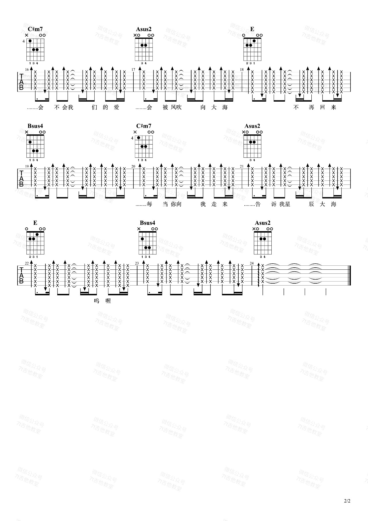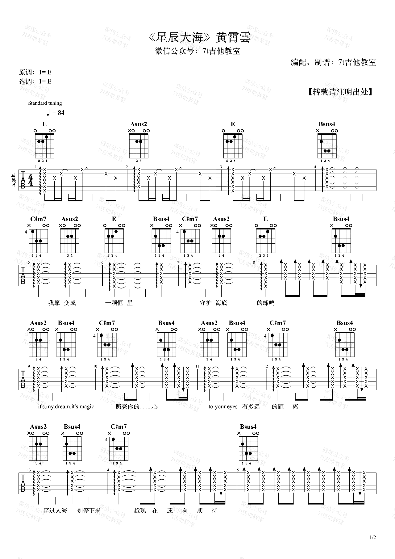 曲谱介绍: 星辰大海吉他谱,黄霄云演唱,原调是E大调,采用的也是E大调的指法来编配。视频里是标准音调弦,变调夹夹在第一品。想弹原调的朋友不用夹变调夹就可以!感谢7T吉他教室出品,琴谱网整理。 和弦分析:这首歌只用了四个和弦,分别是一级、四级、五级和六级和弦。整首歌的走向是6415为主,这个和弦走向可以说相当普遍,很多现代流行歌都喜欢用这个简单又好听的走向,比如《平凡之路》、《夜空中最亮的星》的副歌、《光年之外》、《晴天》的主歌等等。由于用的和弦较少,为了让效果不那么单调,四级用了sus2,五级用了sus4,六级用了小七,这几个和弦在吉他上用E调指法很有意思,它们都是让第一、二弦保持空弦,三、四、五弦负责根音和五音,听起来十分空旷舒服。