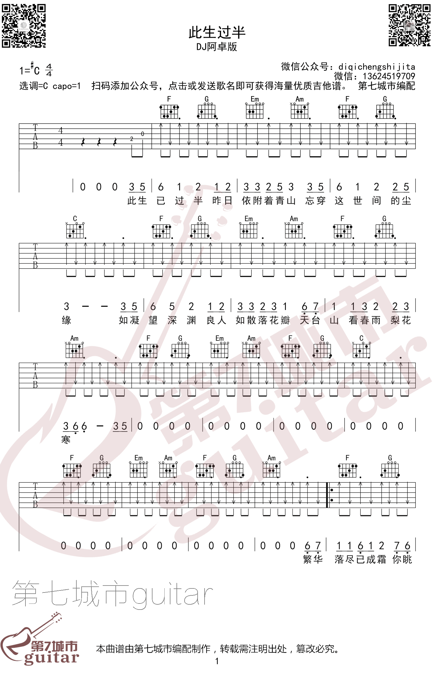 曲谱介绍: 此生过半吉他谱,DJ阿卓版,一首因舞小喵火爆网络的热门歌曲。原唱豆包,此生过半吉他六线谱,原调升C选调C,变调夹夹一品。三张弹唱图片谱例,第七城市制谱编配,琴谱网更新上传。